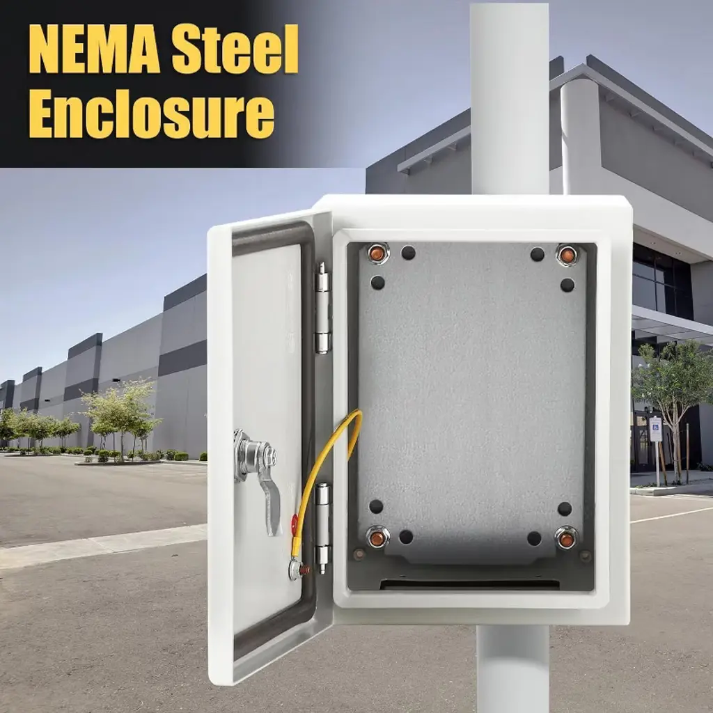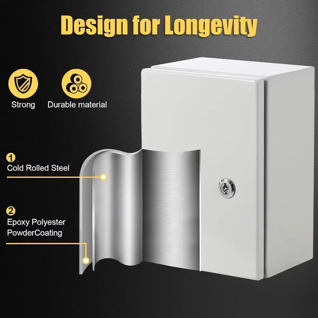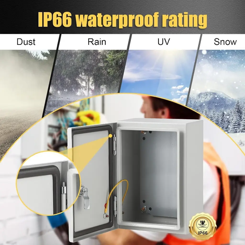 Outdoor Electrical Box, IP66 Waterproof & Dustproof, Electrical Junction Box with Mounting Plate for Indoor Outdoor UseThis heavy-duty electrical box is constructed from 0.06-inch (1.5mm) cold-rolled steel, providing excellent impact resistance, flame retardancy, and electromagnetic shielding. Designed to meet IP66 and NEMA 4X waterproof standards, it protects internal components from water, dust, snow, and UV exposure. Equipped with a robust safety lock, high-strength hinge, and ground screw, it ensures durable and secure electrical installations. Easy to install with pre-drilled mounting holes and convenient cable access, this versatile enclosure is suitable for a wide range of industrial, commercial, and residential applications.