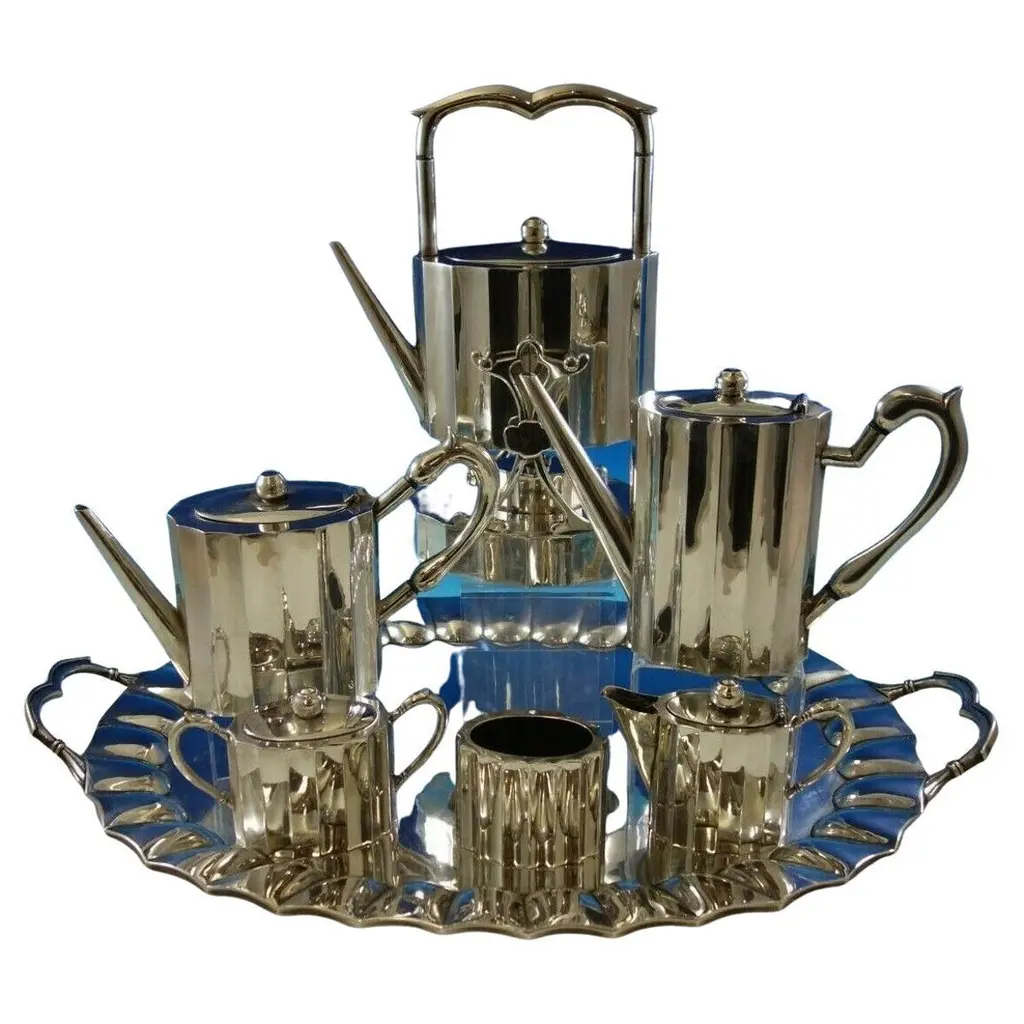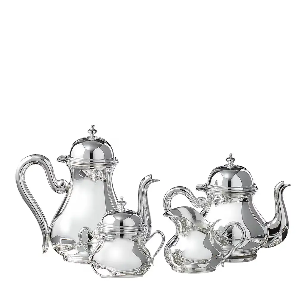 Brimming with class and opulence, this ornate set for 8 people allows for enjoying a good cup of coffee while immersed in a refined English atmosphere. It counts a teapot (W: 22.5 cm, D: 15 cm, H 14 cm), a coffee pot (W: 18.5 cm, D: 10 cm, H 18.5 cm), a sugar bowl (W: 8.5 cm, D: 8.5 cm, H 11.5cm), and a milk jug (W: 8.5 cm, D: 8.5 cm, H 9 cm) all boasting a gleaming silver plating.