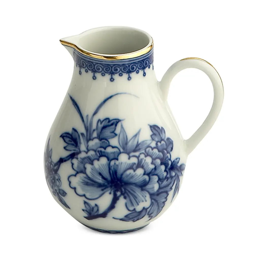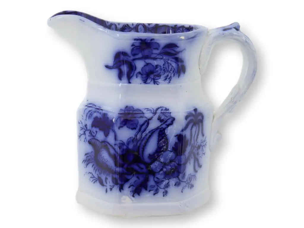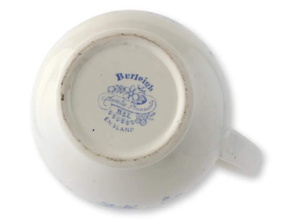 Midcentury Burleighware pitcher in the classic Asiatic Pheasant pattern, featuring soft blue transferware florals on white ceramic. A timeless English design dating to the 19th century, this version was produced by Burleigh in the mid-20th century and carries the warmth of traditional English kitchens. A charming addition to a collection or perfect for serving or display. Marked on underside.