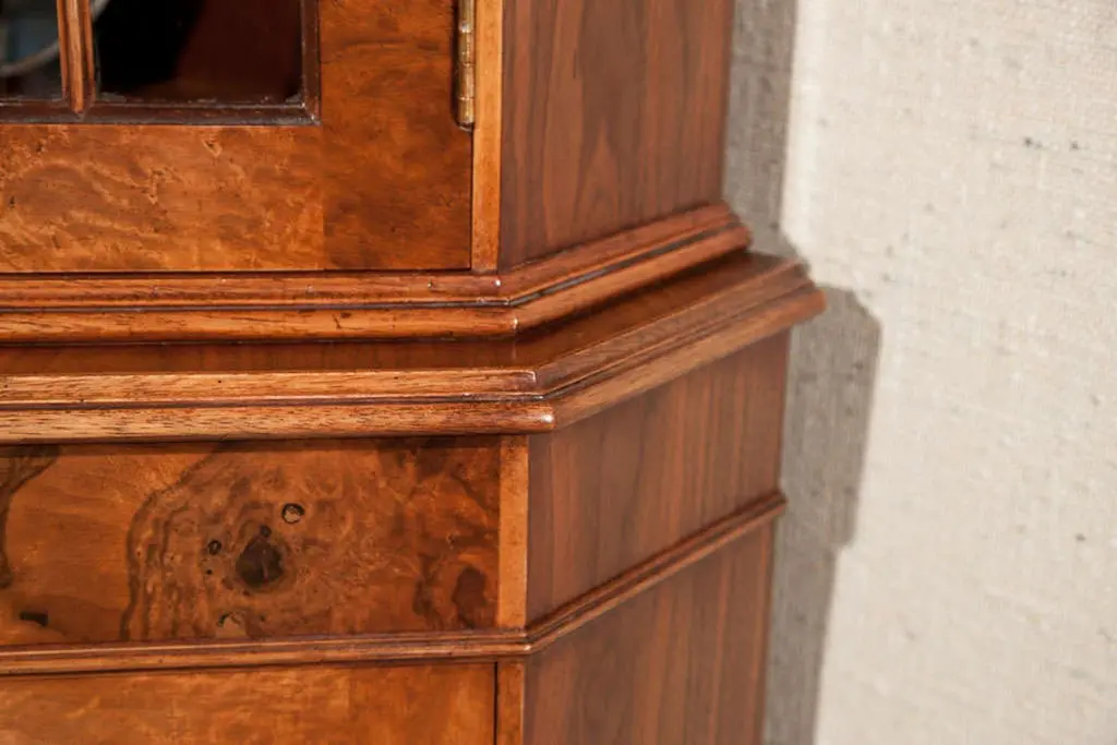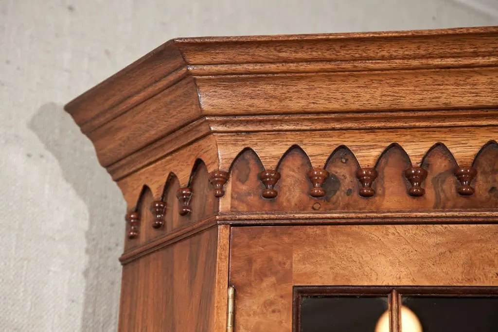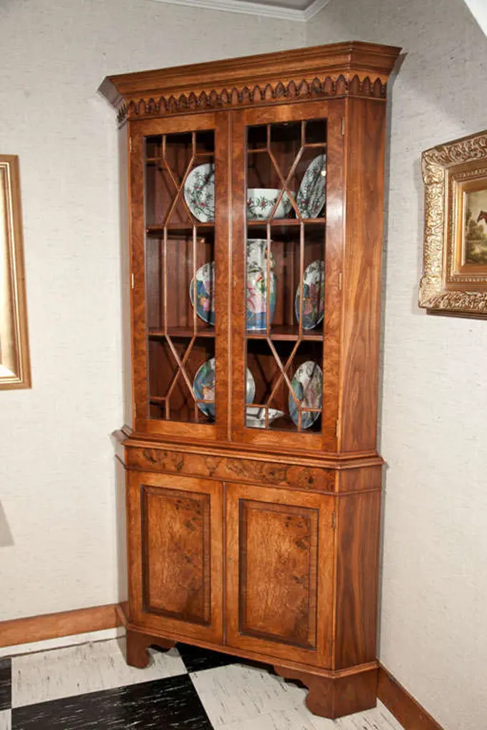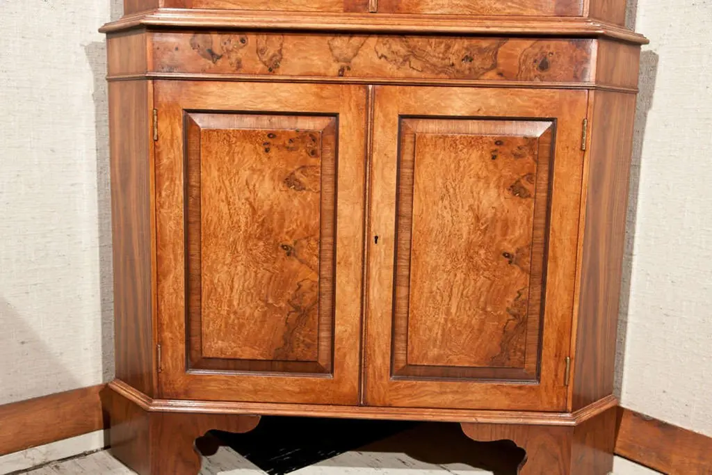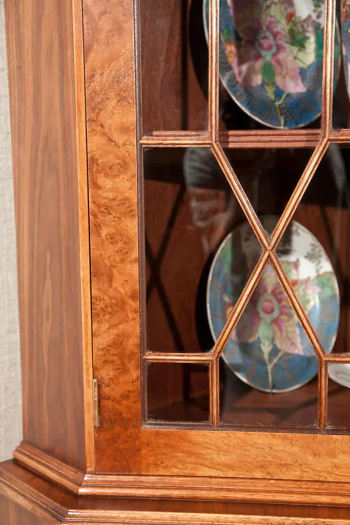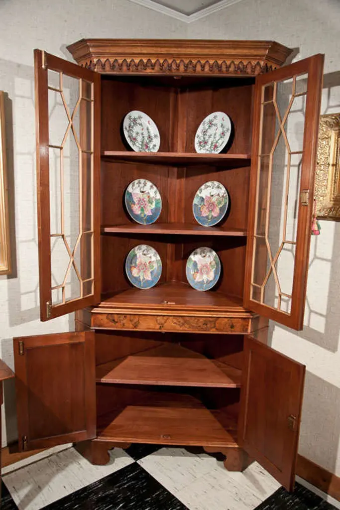 This custom English walnut, glazed door corner cupboard is just the right size to take up residence in just about any corner you can come up with. Measuring 30 1/2" along the back from the corner to the side, this can tuck in between a window and a corner with relative ease. Classically styled from the arcaded cavetto moulding to the 13 pane glass and covered in a rich walnut grain, this corner cupboard is ready to occupy your corner for years to come.