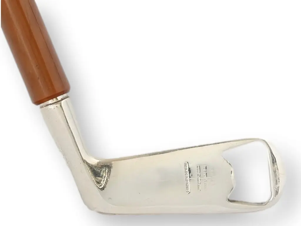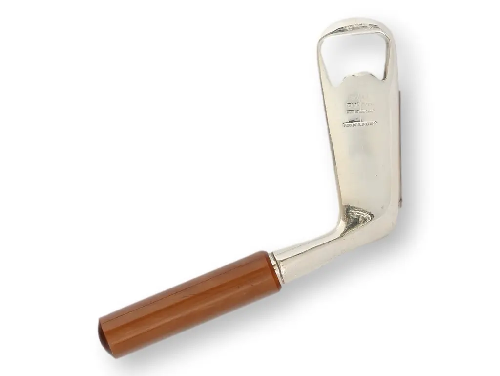 This vintage English bottle opener combines elegant silver-plate with a sleek Bakelite handle, showcasing midcentury design and practicality. The sturdy construction and classic style make it a functional yet stylish addition to any barware collection. Perfect for entertaining or as a thoughtful gift for vintage enthusiasts, this piece adds a touch of charm to any occasion. Maker's marks on back side.