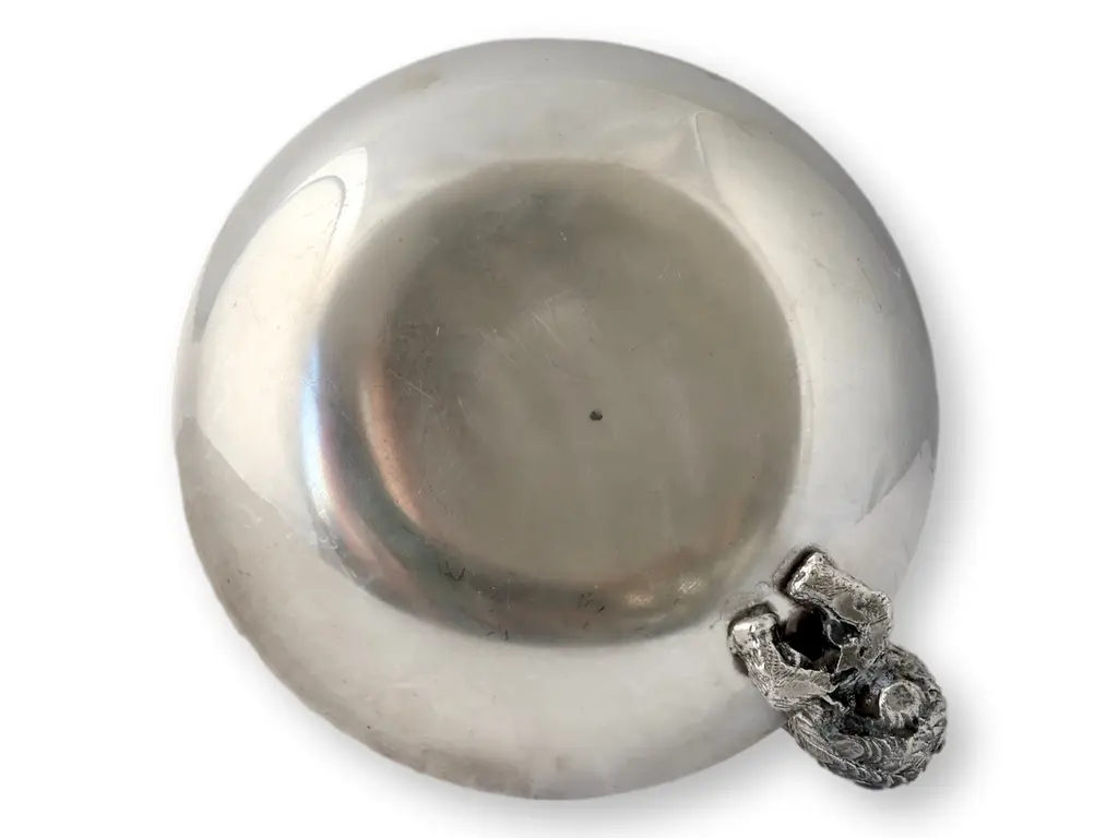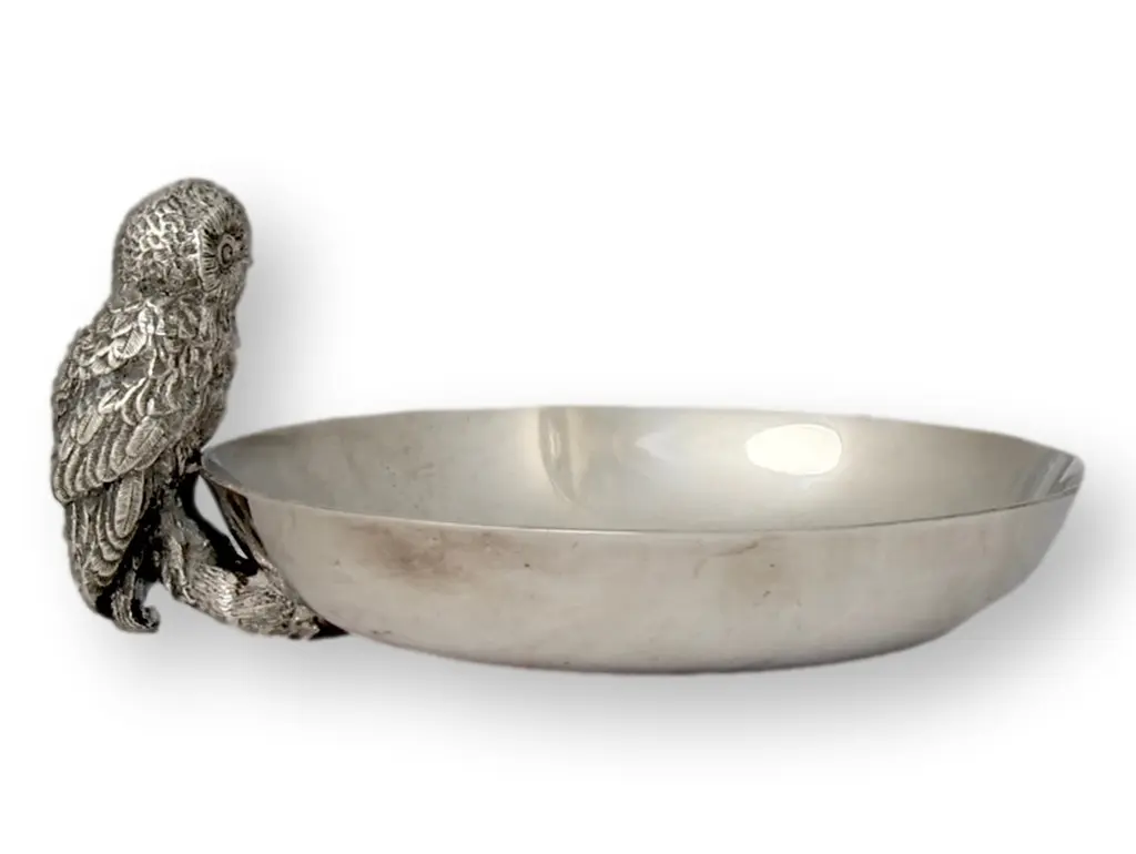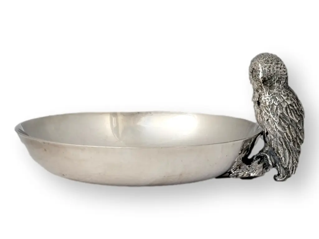 Charming English silver-plated trinket or coin dish featuring a finely detailed owl perched at the rim. Likely mid-20th century, this whimsical piece is unmarked but well-crafted, with light surface wear consistent with age. A delightful catch-all for bedside or entry table, perfect for holding rings, coins, or cufflinks. A wise choice for collectors or lovers of unique animal-themed silver. Unsigned.