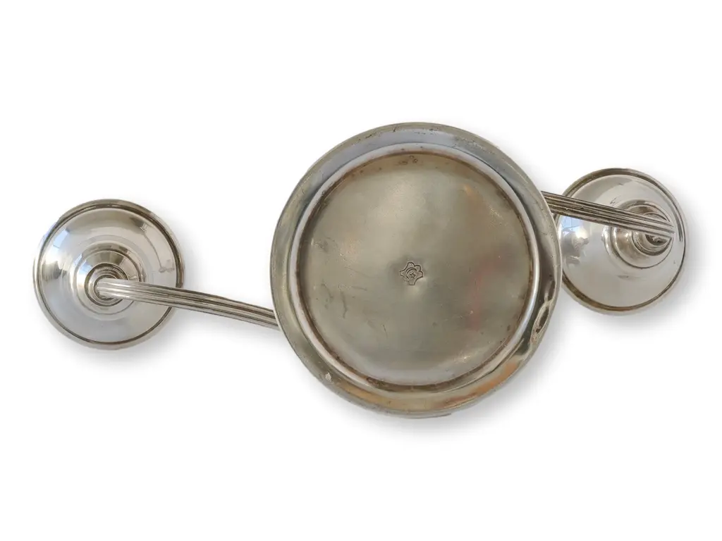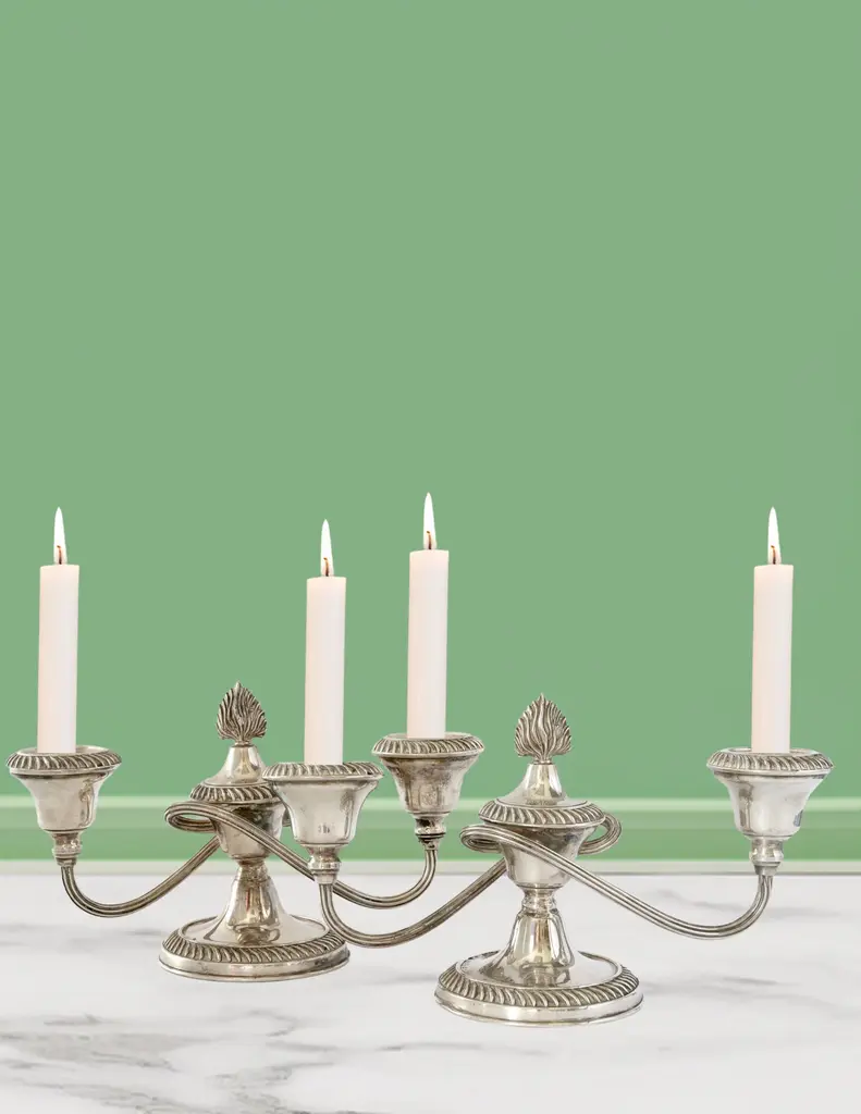 Elegant pair of English silver-plate candelabra with classical reeded borders and flame finials. Each holds three taper candles with gracefully curved arms extending from a central base. Stamped with a maker�������������s mark on the underside, these timeless accents bring refined symmetry and traditional charm to any table or mantel display. A striking statement for formal or everyday settings.