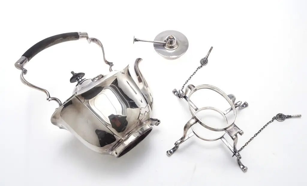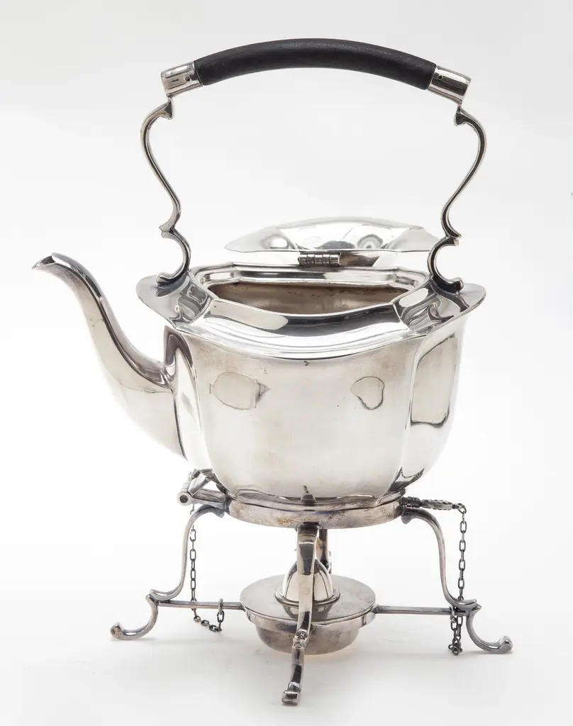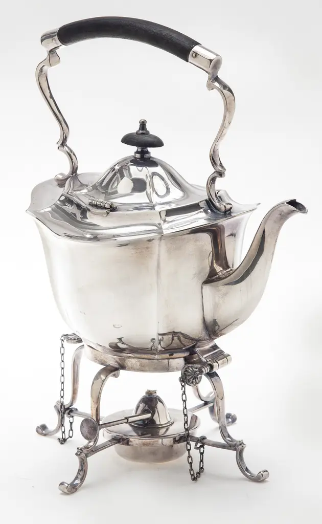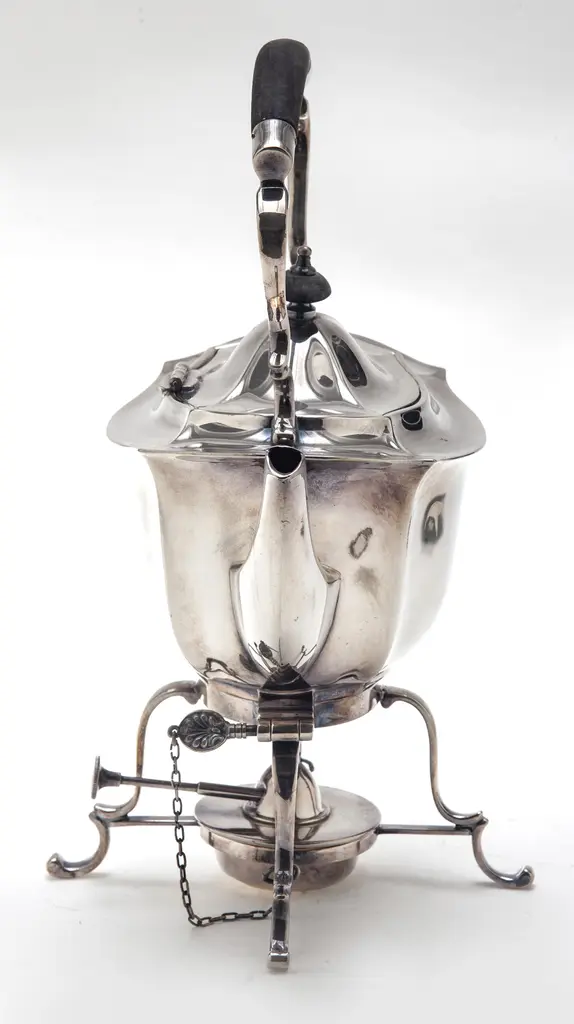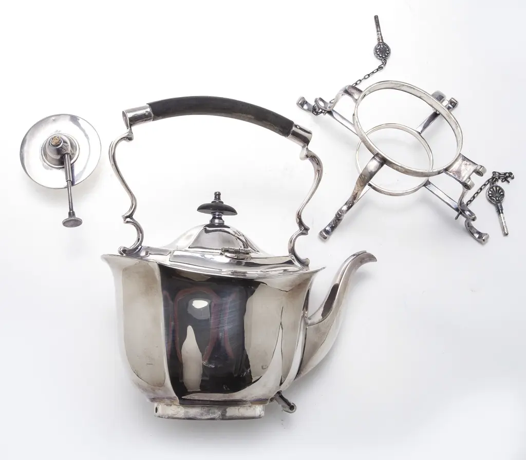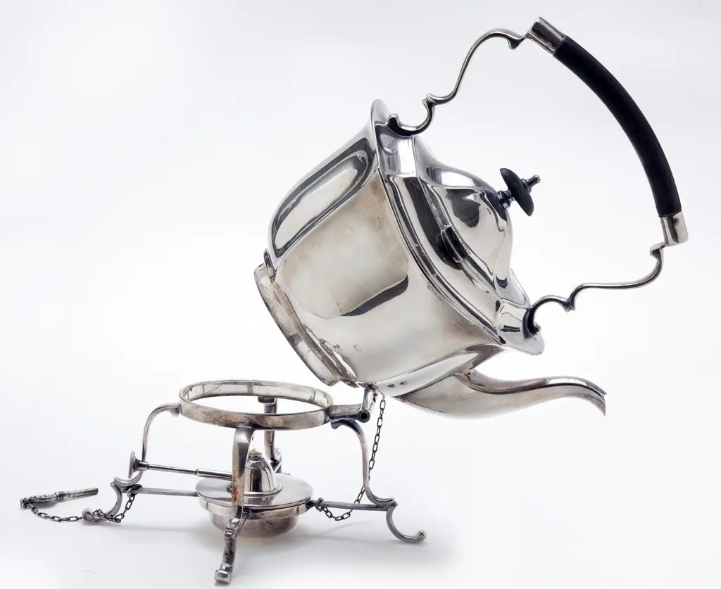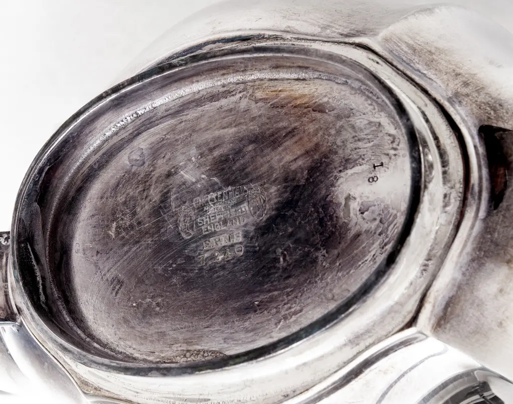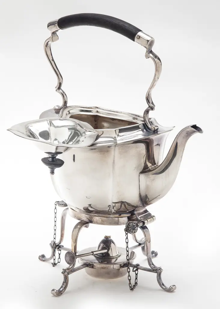 An exceptional example of an antique Sheffield English silver plate teapot on a warming stand in pristine condition. This elegant teapot is simple & unembellished. It is fitted with a flush hinged top which retains the original ebony wood handle & finial. The warmer has fine security chains & sits on graceful curved feet which mimics the design of the handle. A stunning piece for use or display. 10ʺW × 7ʺD × 11.5��H