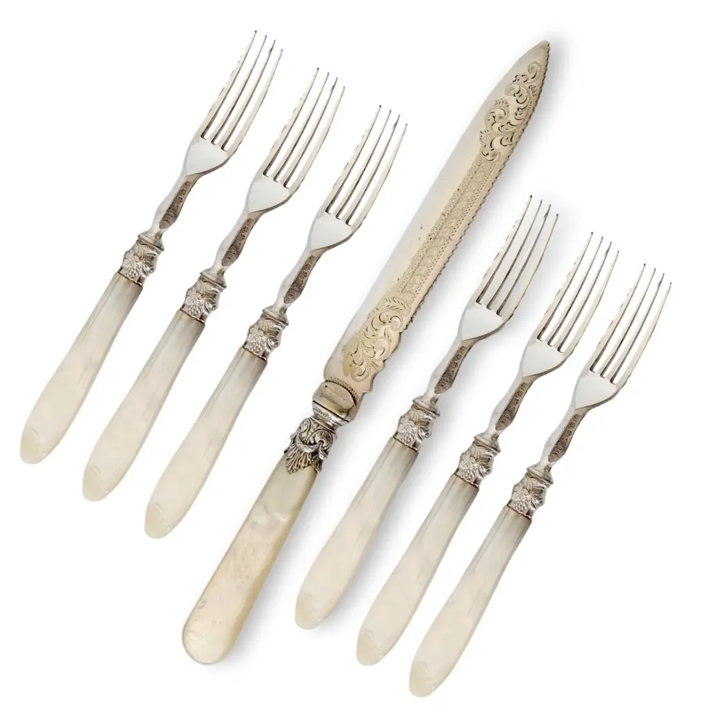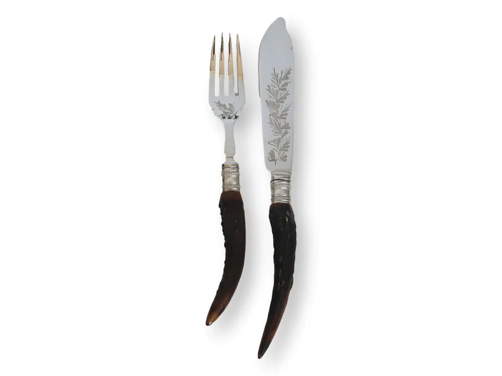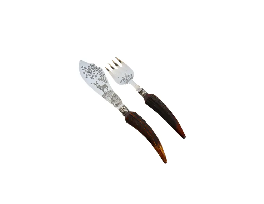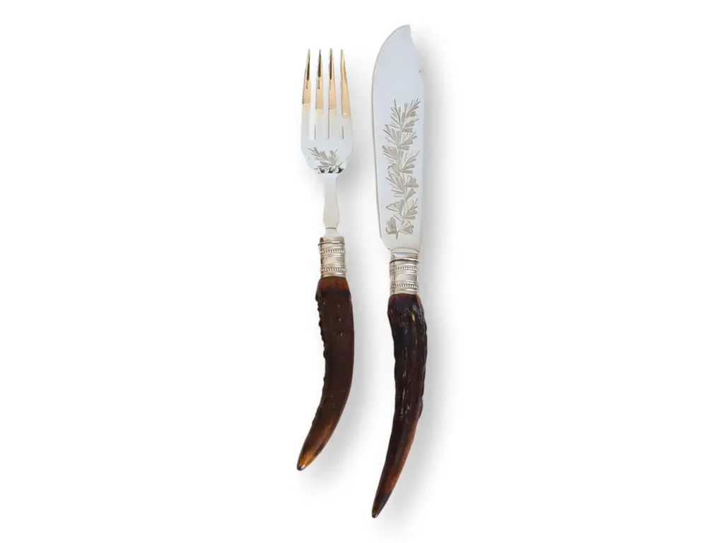 Early 20th-century English design with this fish serving utensil set. Silver-plated blades showcase intricate etchings, including a stately elk on the serving knife, radiating historical charm. A blend of beauty and function, this set is a treasure for those who value time-honored craftsmanship. Dimensions: 6 forks, 8"L x 1"W x .5"H; 6 knives, 9.5"L x 1"W x .5"H; serving fork, 9.75"L x 1.75"W x .75"H; serving knife, 12.5"L x 2"W x 1"H. Impressed stamps on each piece.