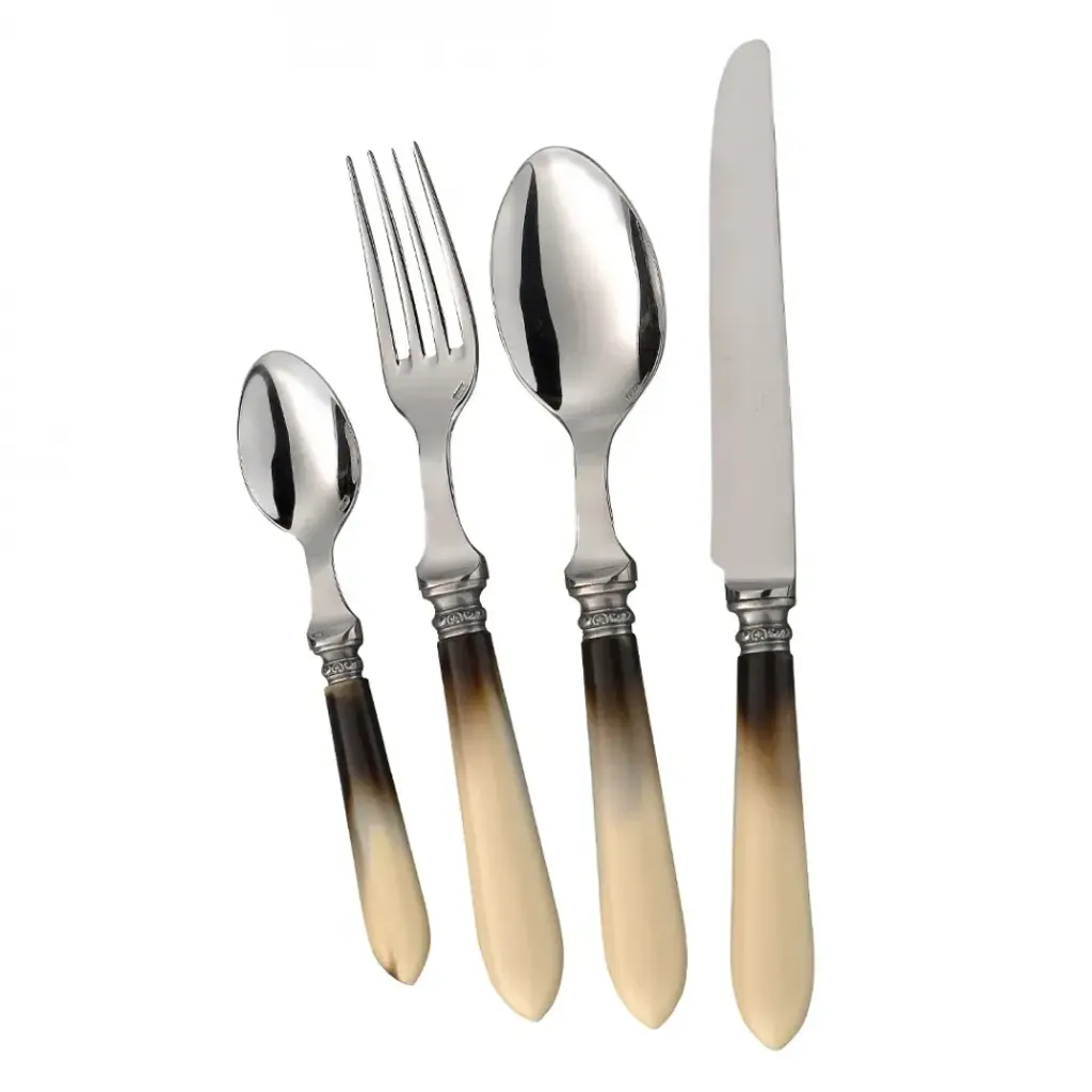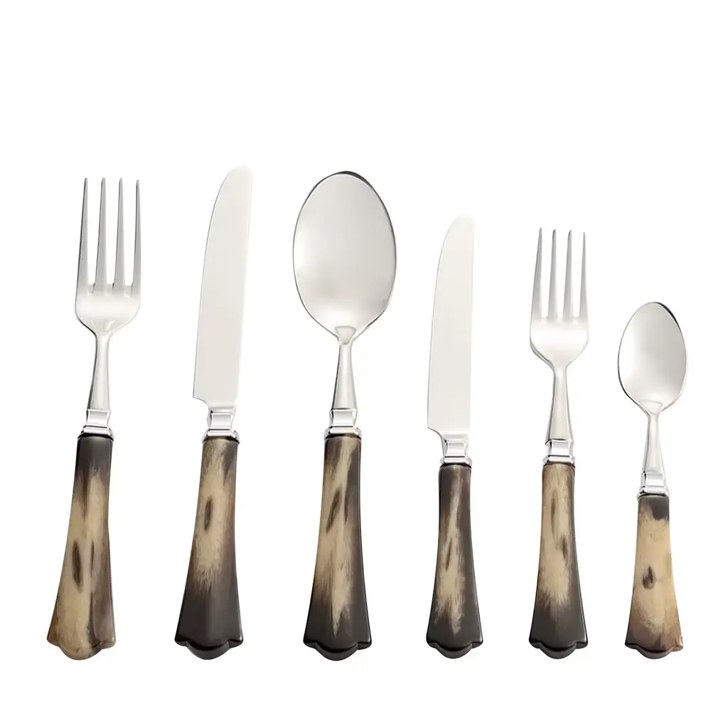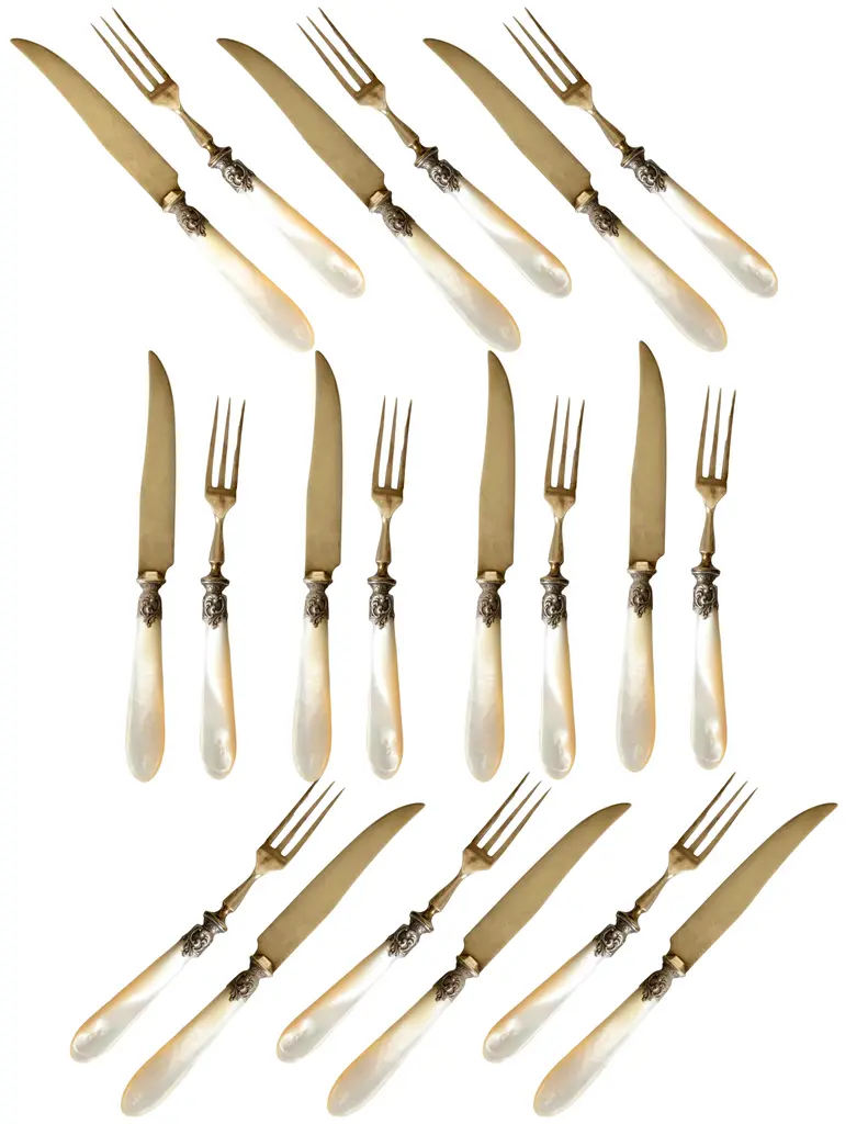 Early 20th-century English design with this fish serving utensil set. Silver-plated blades showcase intricate etchings, including a stately elk on the serving knife, radiating historical charm. A blend of beauty and function, this set is a treasure for those who value time-honored craftsmanship. Dimensions: 6 forks, 8"L x 1"W x .5"H; 6 knives, 9.5"L x 1"W x .5"H; serving fork, 9.75"L x 1.75"W x .75"H; serving knife, 12.5"L x 2"W x 1"H. Impressed stamps on each piece.