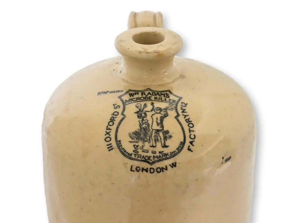 William Radam's Microbe Killer potion, marked by bold claims to cure all diseases, is captured in this classic piece. It stands as a testament to historical medical practices and is an intriguing conversation piece for collectors of medical antiques or those fascinated by Victorian-era curatives. Maker's mark on front.