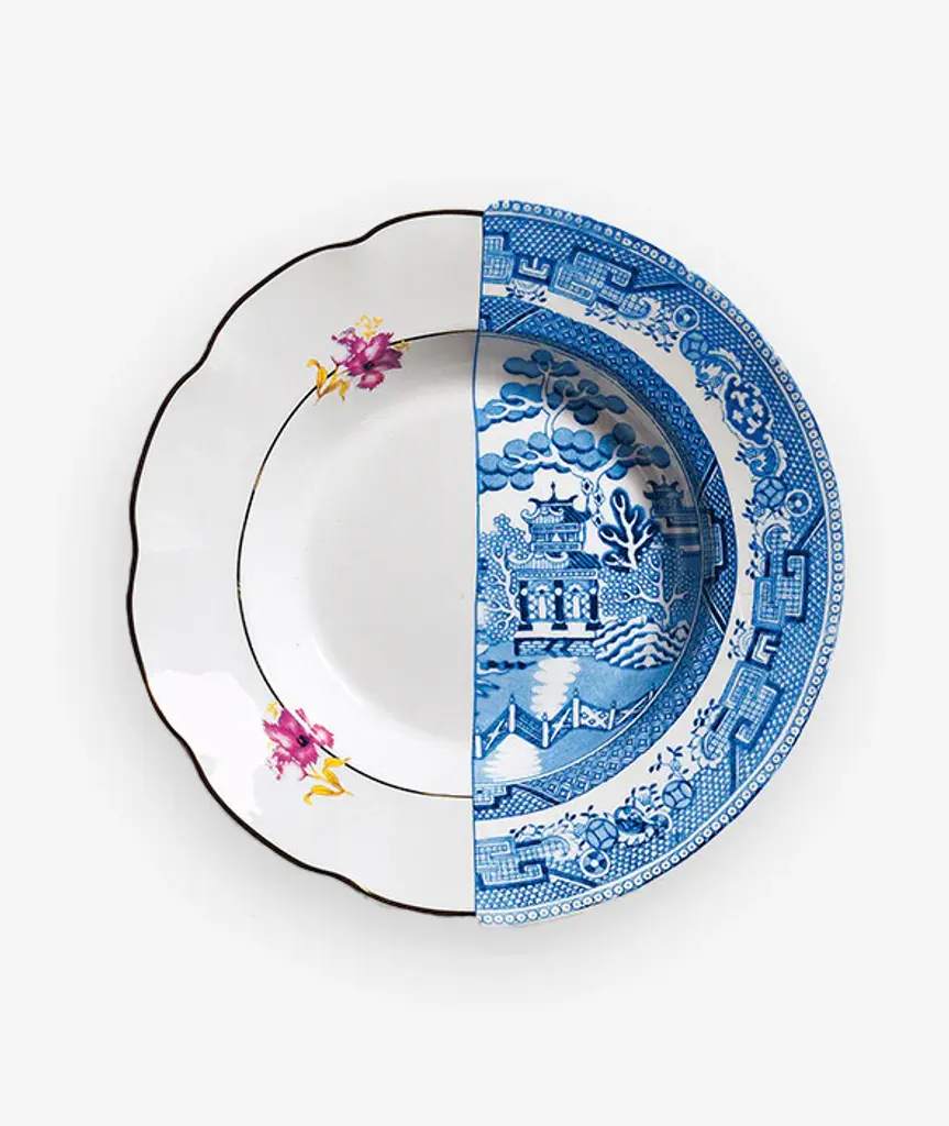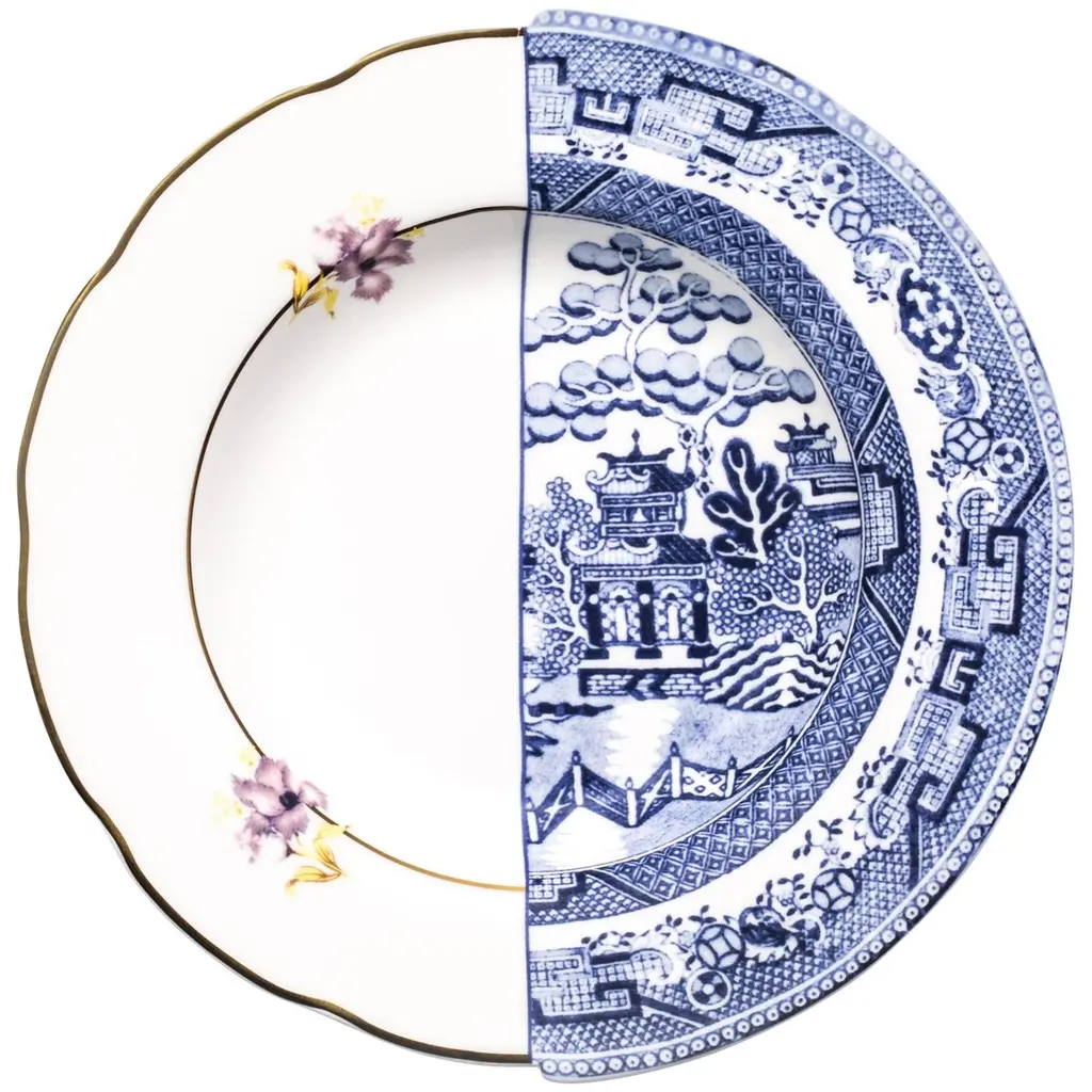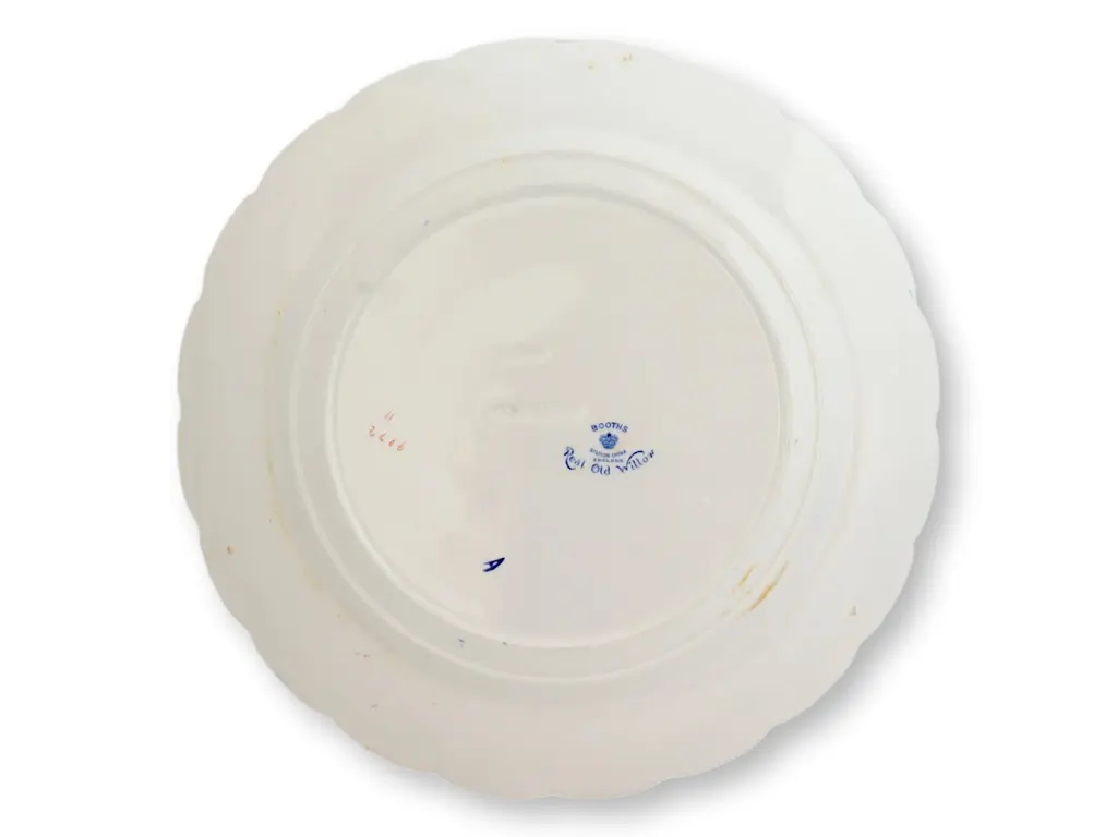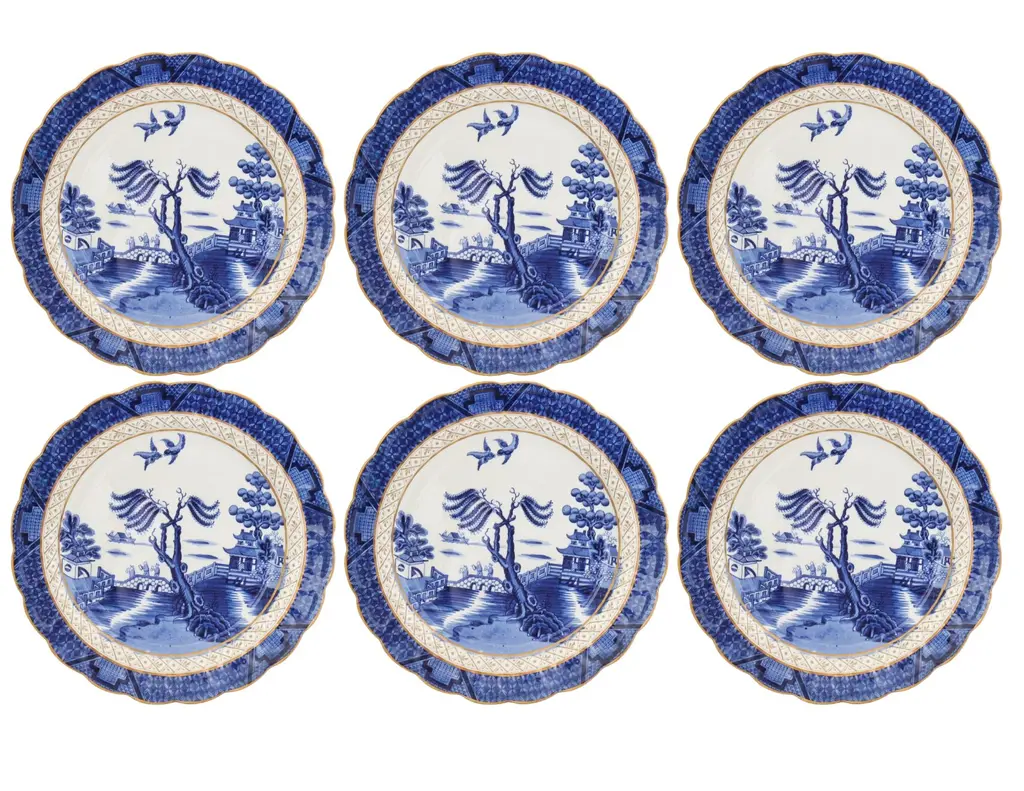 Set of six large Willow Pattern dinner plates by Booth's, a cherished English classic. This enduring pattern, hailing from one of England's most prominent makers, embodies timeless elegance. The large Euro sized dinner plates are the most difficult to find in set, especially with the fancy gilded edges. Maker's mark on back.