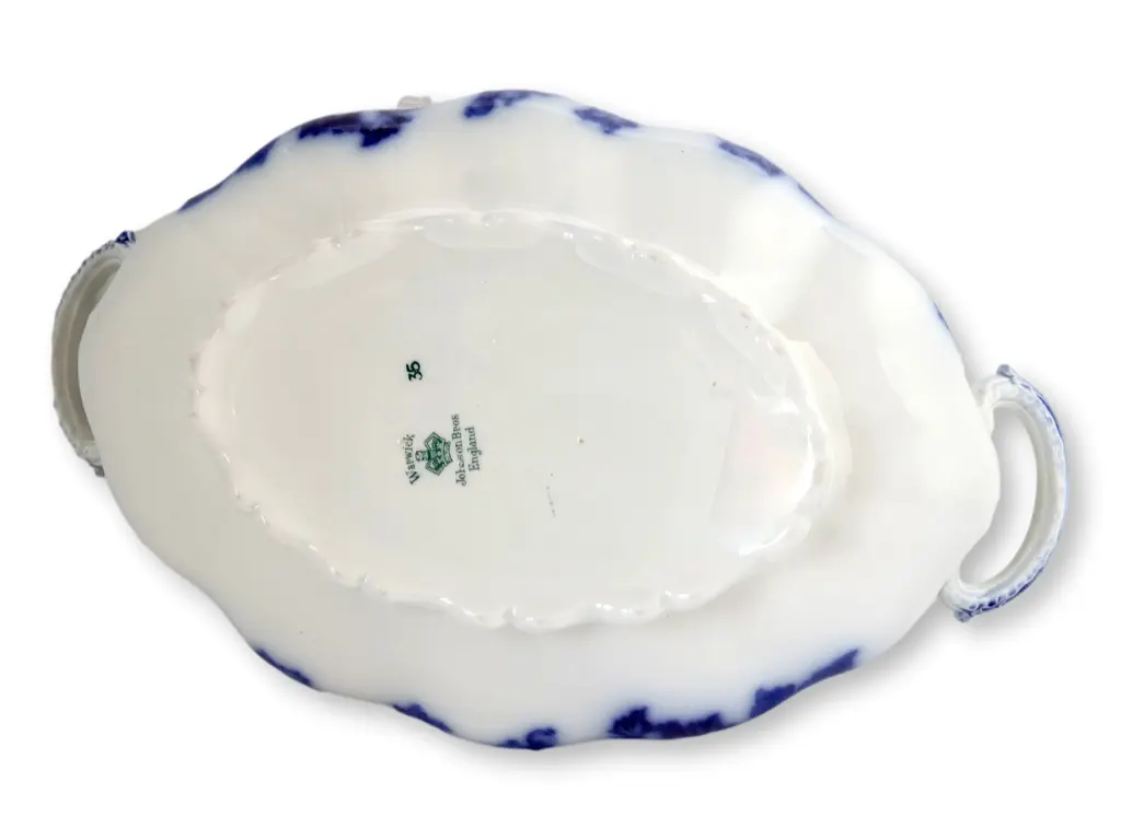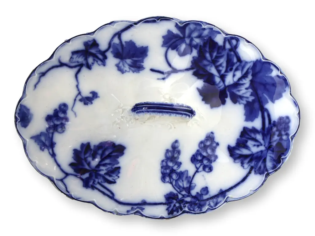This elegant English flow blue covered dish, in the "Warwick" pattern, features a stunning grapevine motif in rich cobalt blue. The intricate design is complemented by gracefully curved handles and a delicately scalloped lid, showcasing exceptional Victorian-era craftsmanship. Perfect for serving or as a decorative piece, this dish blends functionality with timeless beauty, making it a standout addition to any collection or table setting. Marked on underside.