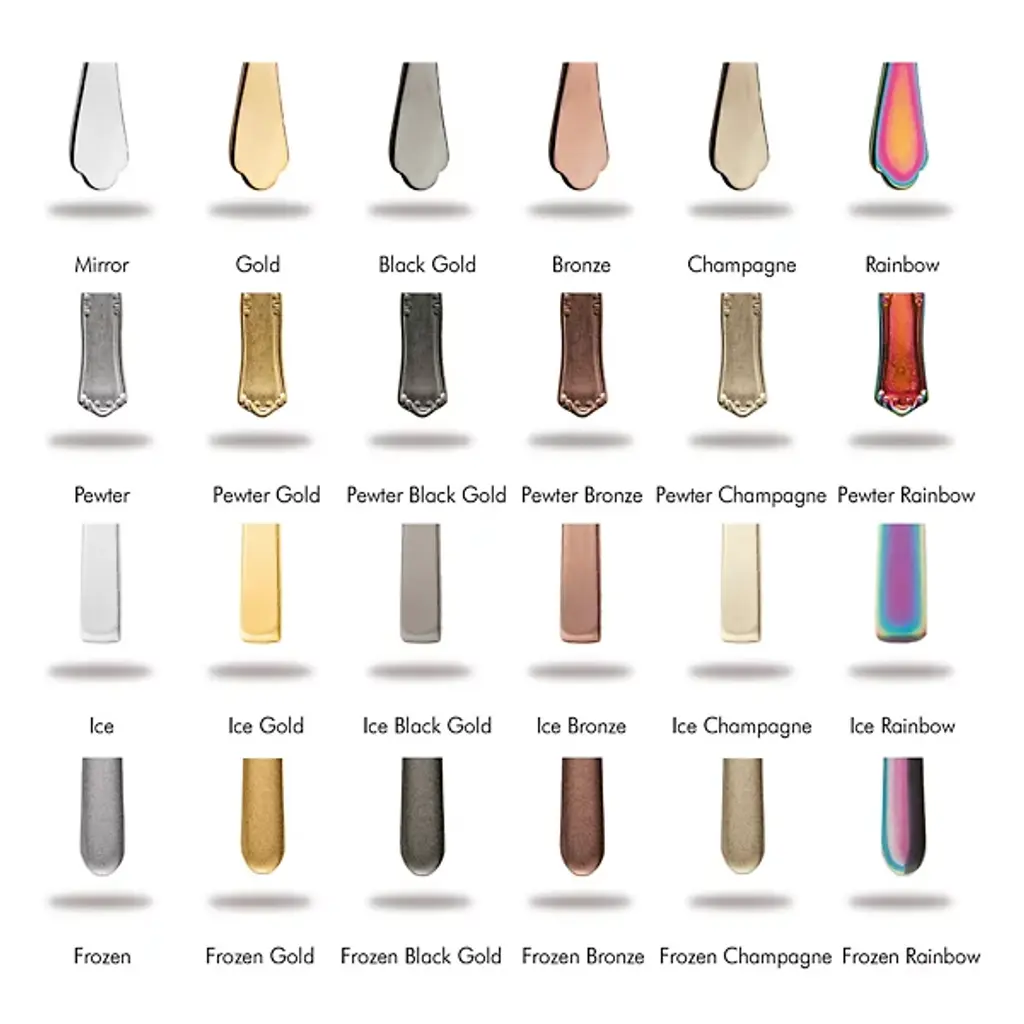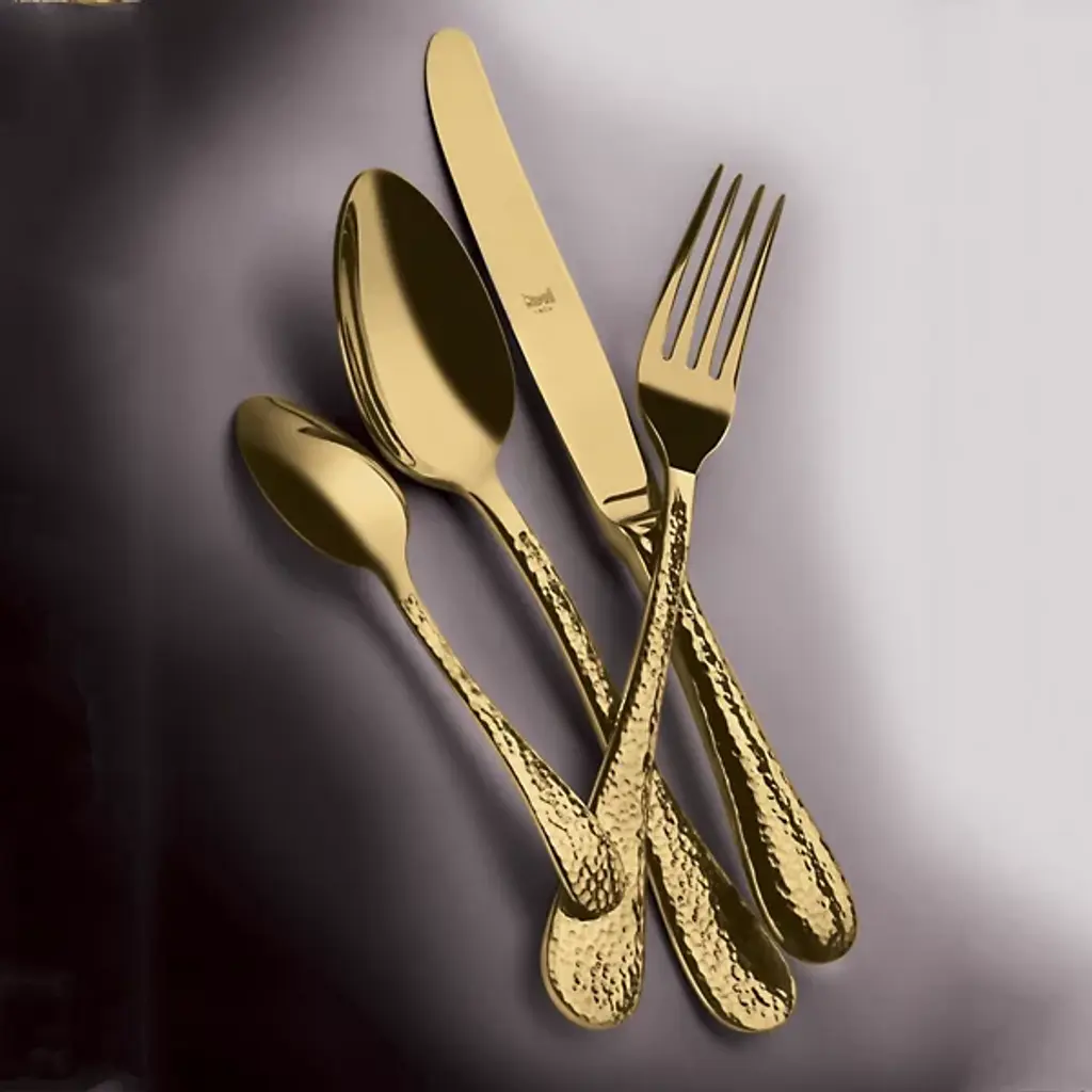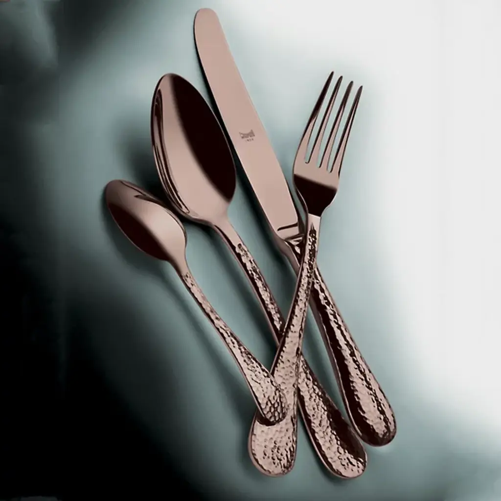 Epoque 20-Piece Flatware Set by Mepra is elegance personified, combining luxury with practicality. Crafted with a focus on durability, the set features 18/10 PVD coated stainless steel, ensuring it withstands the test of time. Made in Italy, it reflects impeccable craftsmanship and attention to detail, making it a statement piece for any dining room. This Luxury/Glam cutlery set is perfect for enhancing your dining experience, offering both aesthetic appeal and functional performance.