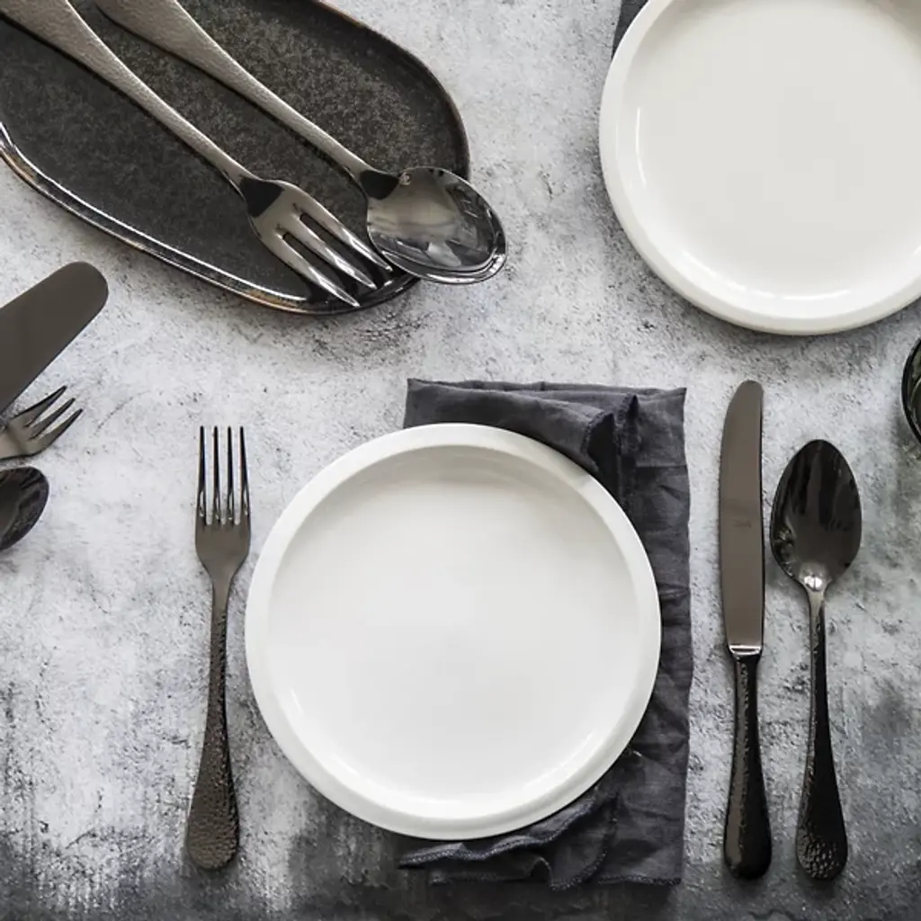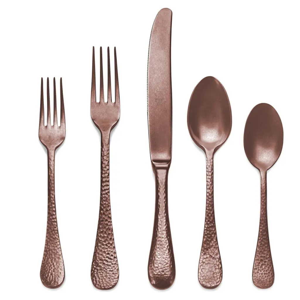 Epoque 5-Piece Flatware Place Setting by Mepra combines elegance and functionality in luxury dining. Made in Italy, this collection features 18/10 stainless steel coated with a PVD titanium layer, ensuring longevity and sophistication. Perfect for stylish gatherings in a luxury dining room setting, this set is dishwasher safe for hassle-free maintenance. With its quality craftsmanship and chic design, the Epoque Cutlery Set is an exquisite addition to any dining decor, enhancing your meal experiences.