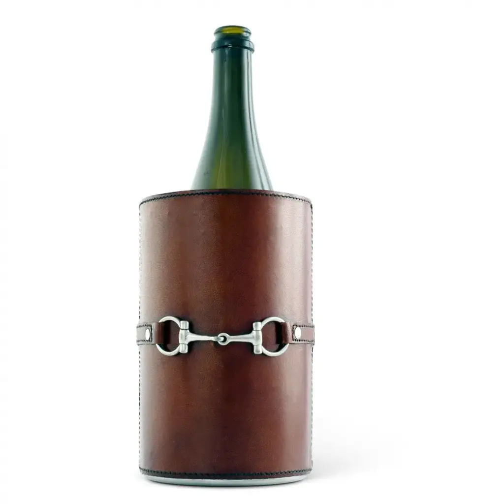 Elevate your home bar with this exquisitely crafted Horse Bit Vegan Leather Ice Bucket. Sublimely sized at 6.5"T x 6.5"W, this piece is perfect for chilling a vintage wine or for mixing classic cocktails. Artfully adorned with detailed pewter horse bit accents and a rich saddle leather wrap, this bucket offers a touch of equestrian elegance to any occasion. Pair it with our matching horse bit leather tray for a complete look. A chic and unique gift for horse lovers and connoisseurs of quality. Vagabond House is a family-owned American company specializing in fine pewter tableware, servingware and giftware. Largely inspired by nature, their exclusive products are designed to be unique, functional heirlooms for those who seek to express tradition and style in both family and formal entertaining.