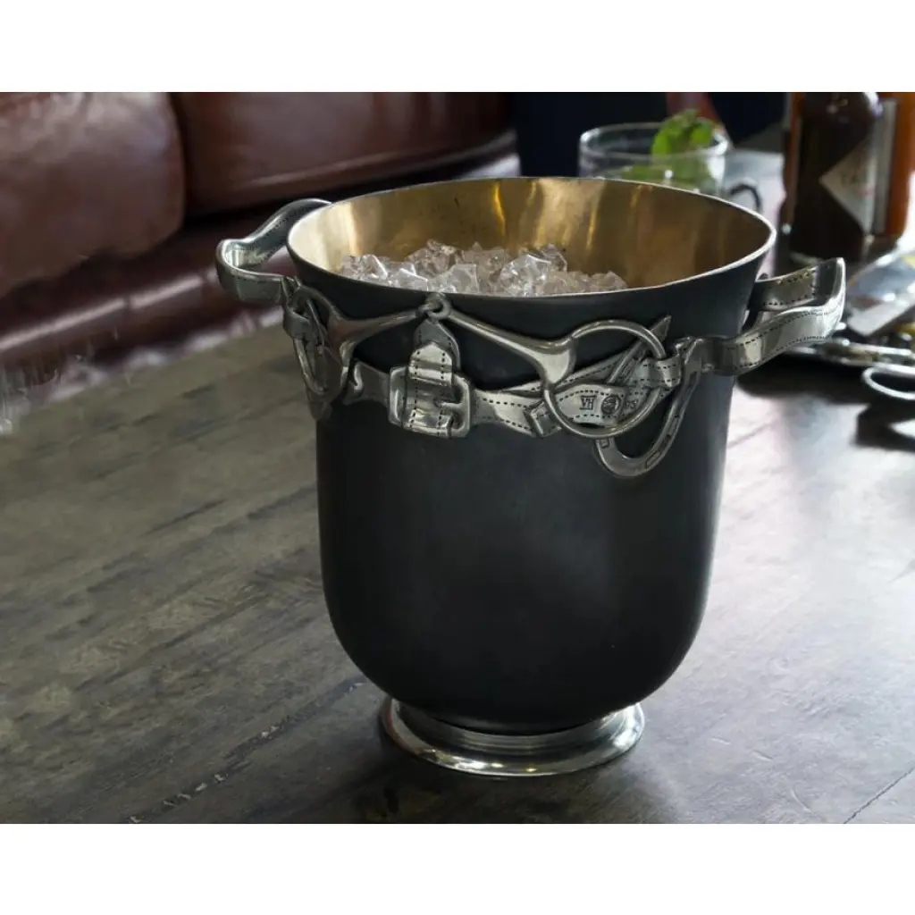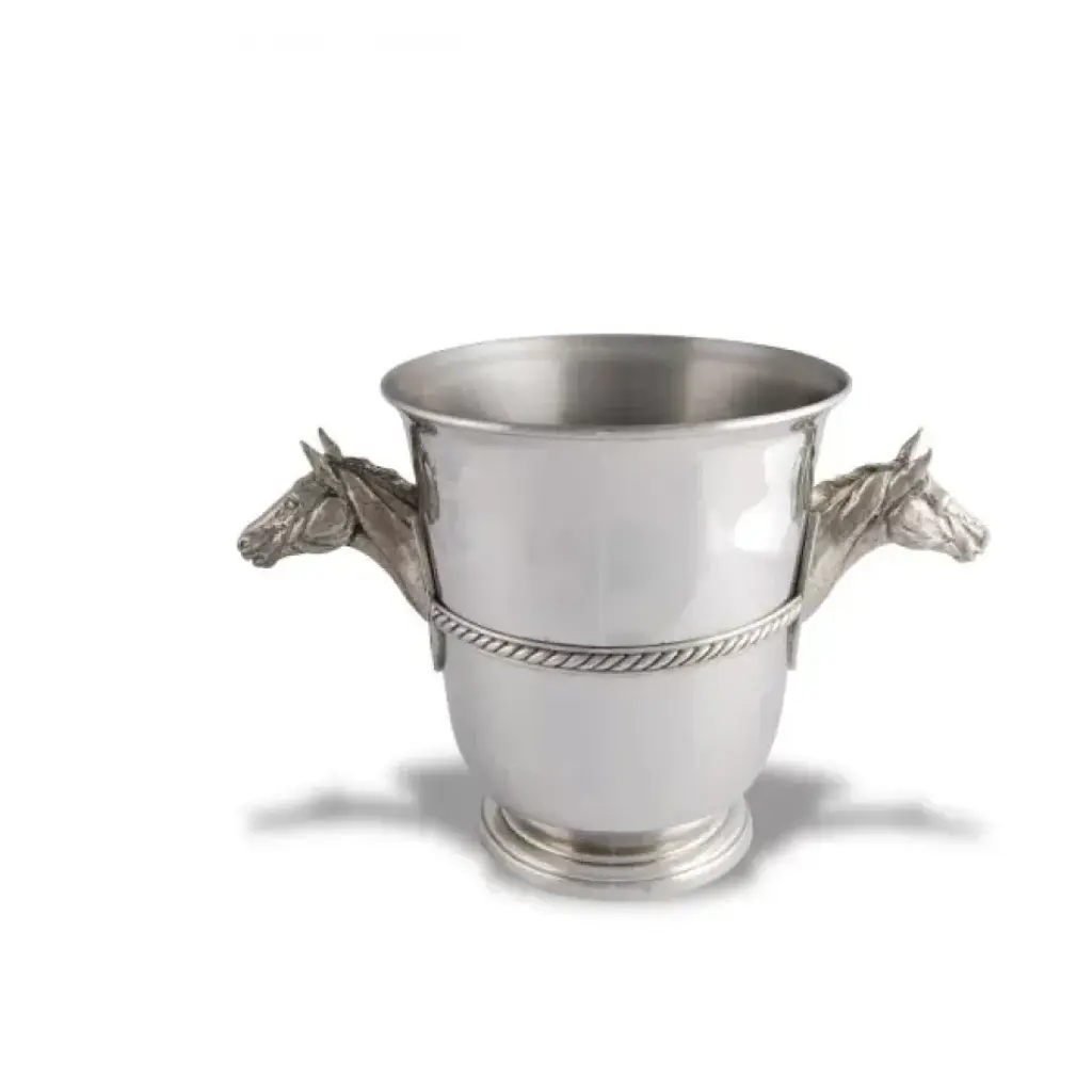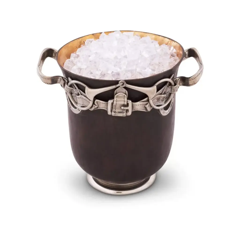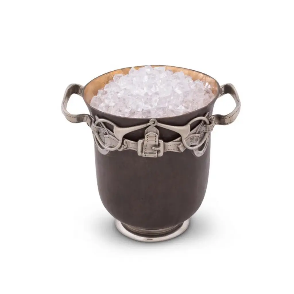 Vagabond House's Luxury Bronze Equestrian Ice Bucket is hand-crafted in pure bronze embellished with pewter O-Rings, saddle straps and horse shoes. Substantial, warm-toned bronze has conductive properties to keep ice cold for hours. A breathtaking piece of table art which will become an heirloom. Vagabond House is a family-owned American company specializing in fine pewter tableware, servingware and giftware. Largely inspired by nature, their exclusive products are designed to be unique, functional heirlooms for those who seek to express tradition and style in both family and formal entertaining.