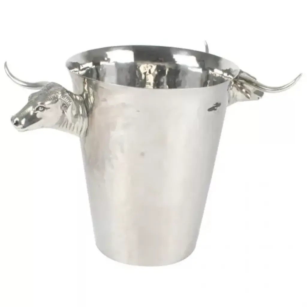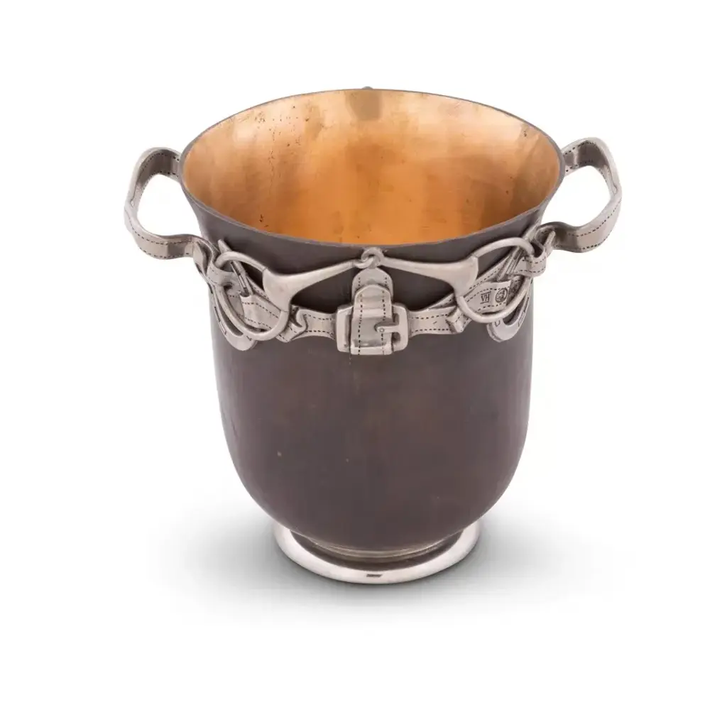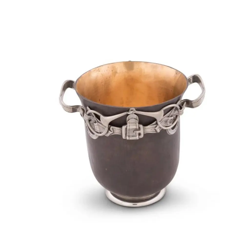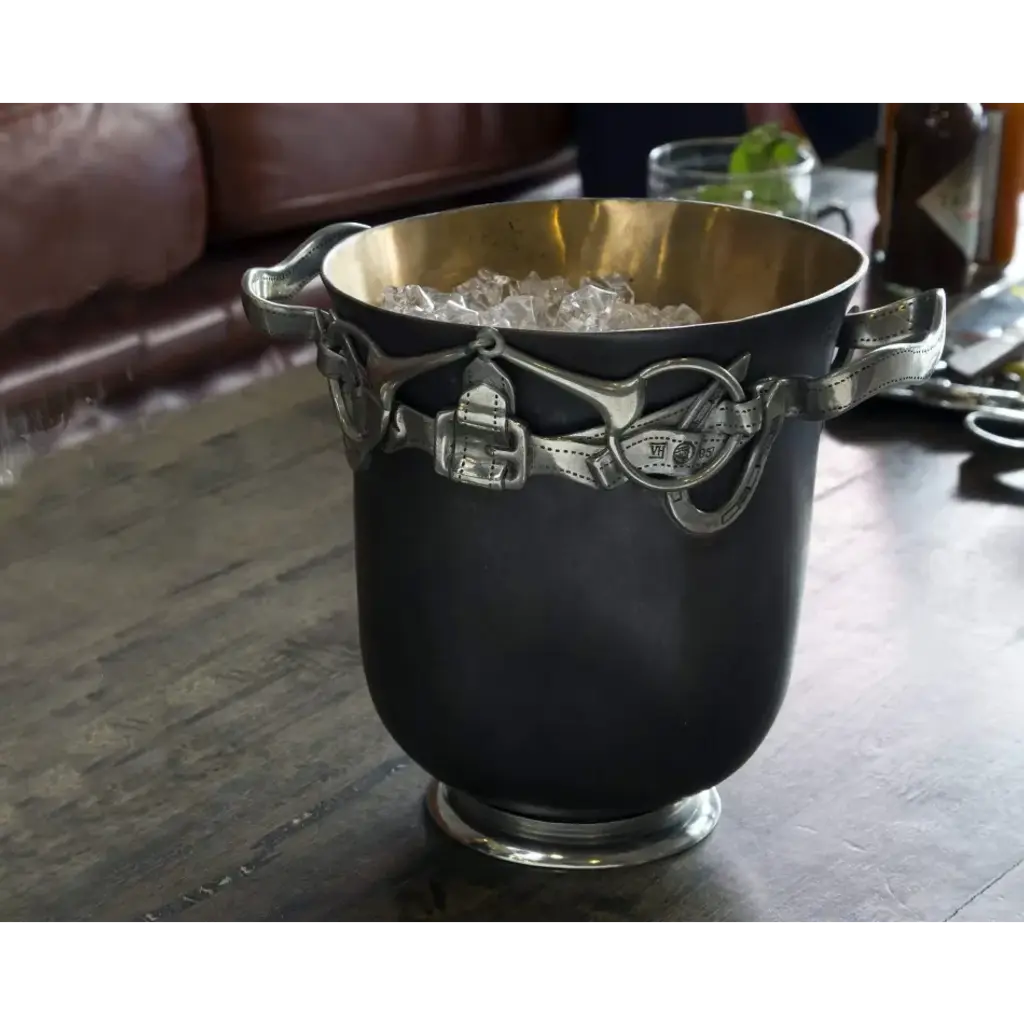 Vagabond House's Luxury Bronze Equestrian Ice Bucket is hand-crafted in pure bronze embellished with pewter O-Rings, saddle straps and horse shoes. Substantial, warm-toned bronze has conductive properties to keep ice cold for hours. A breathtaking piece of table art which will become an heirloom. Vagabond House is a family-owned American company specializing in fine pewter tableware, servingware and giftware. Largely inspired by nature, their exclusive products are designed to be unique, functional heirlooms for those who seek to express tradition and style in both family and formal entertaining.