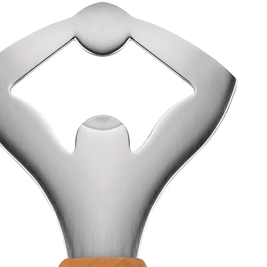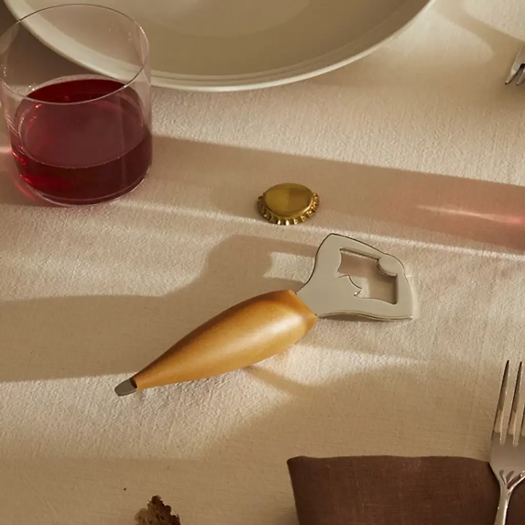 The Ercolino Bottle Opener from Alessi creates peace of mind with a pairing of enduring materials and a familiar yet artful silhouette. Creator Andrea Branzi’s pieces balance the surreal and the romantic. This tone marries with Branzi’s love for wood. Here, birchwood is honed into a bullet shape to showcase its charming grain texture and provide great grip. The stainless steel opener flares out with contours evocative of a hugging figure. These solid contours create a wedge for easy opening of crown caps.