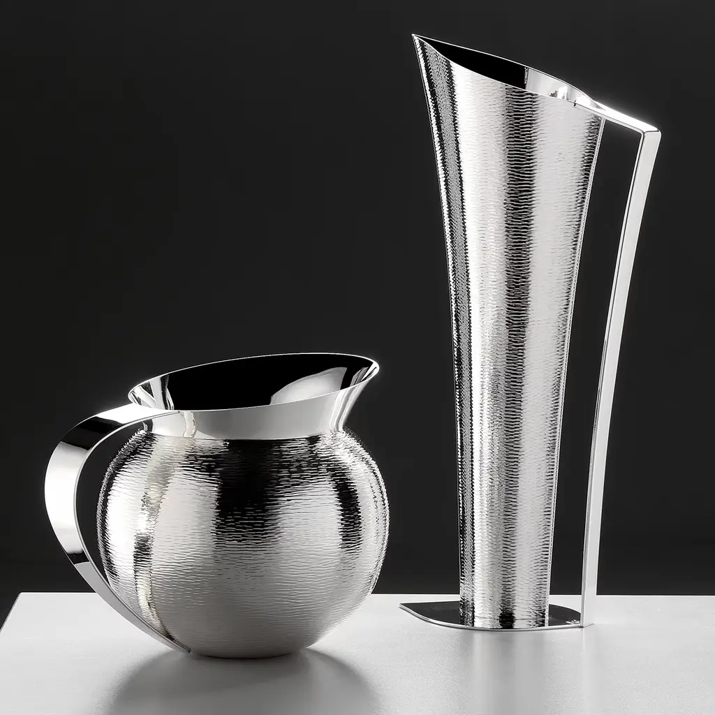 Sculptural pitcher crafted in a silver-plated alloy with a stunning texture.