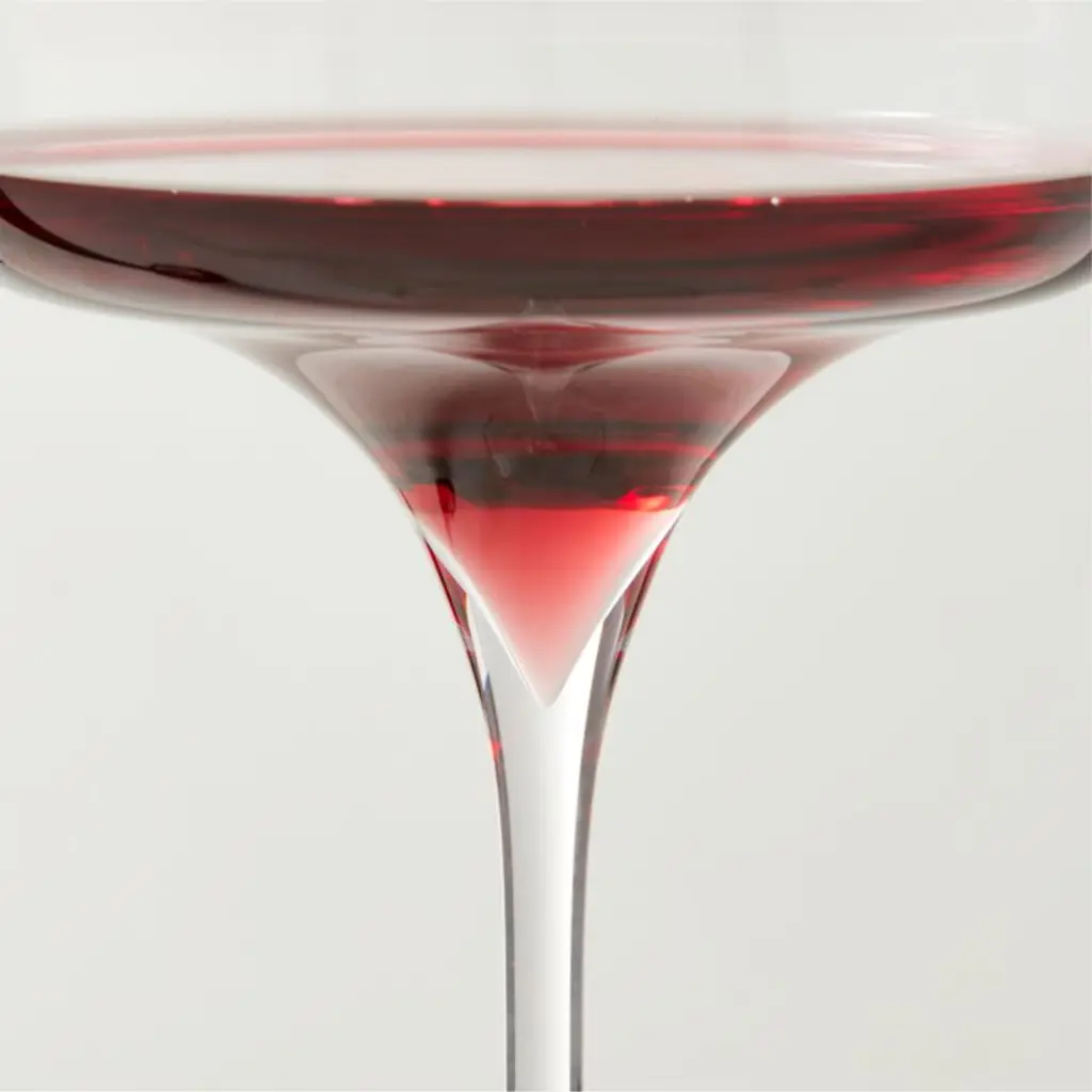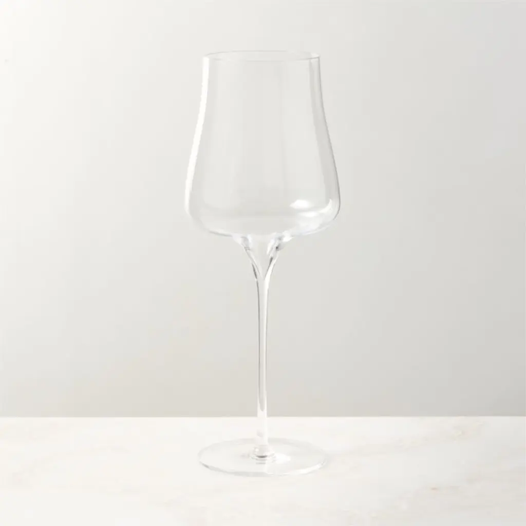Red wine glass exudes elegance with its slim stem and flared bowl crafted of crystal-clear glass. The generously sized bowl is handblown into a mold, then pulled into the stem for a unique, pointed silhouette. Crafted in southern Poland, a region renowned for producing high-quality glassware since 1923. CB2 exclusive.