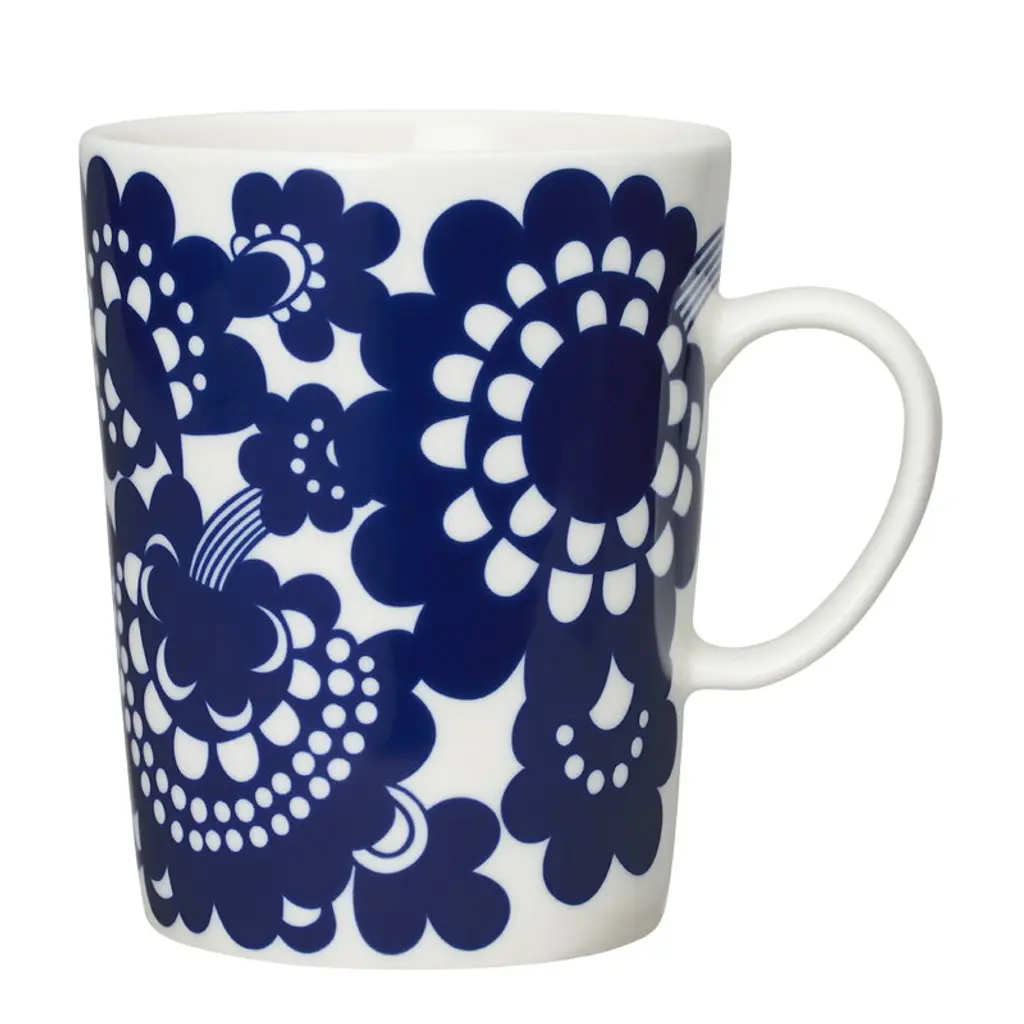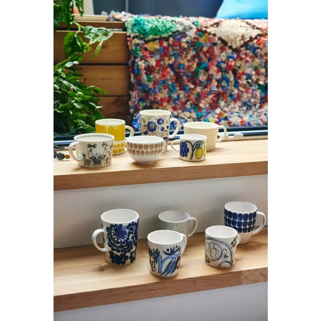 Arabia’s Esteri mug features a beautiful floral motif, designed by Esteri Tomula in honor of the factory’s centenary in 1973. Named after its designer, the Esteri pattern adorned tableware originally both in blue and brown. The fresh blue-and-white pattern adds a lovely touch of Finnish design of the 1970s to casual dinners as well as celebrations. The large, 16.91 fl oz (5 dl) giant mug is a great choice for various beverages, from morning coffee to afternoon tea or warming cocoa in the evening.