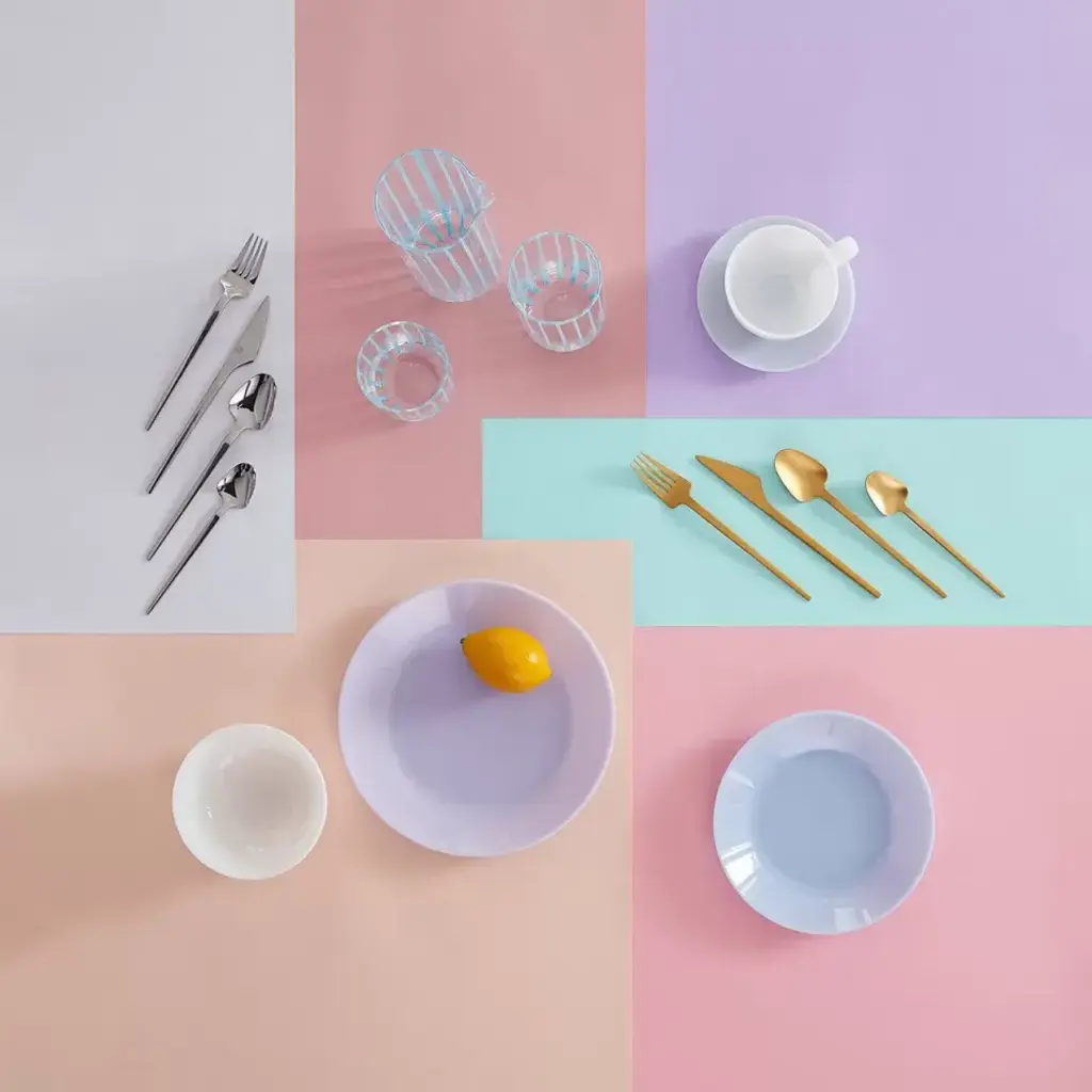 Heaven Sent. Go beyond porcelain and set a dreamy table with our surprising new collection of dishwasher-safe dinnerware made from opaline glass in heavenly hues of purple, blue, and ivory. Strong enough for everyday, but glamorous enough for a socialite soirée. Float. Float on... Set includes one lavender dinner plate, one blue salad/dessert plate, one pearl bowl, one light grey saucer, and one pearl mug.