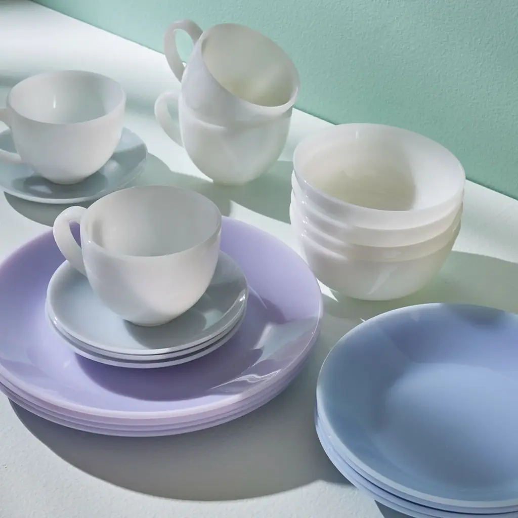 Heaven Sent. Go beyond porcelain and set a dreamy table with our surprising new collection of dishwasher-safe dinnerware made from opaline glass in heavenly hues of purple, blue, and ivory. Strong enough for everyday, but glamorous enough for a socialite soirée. Float. Float on...