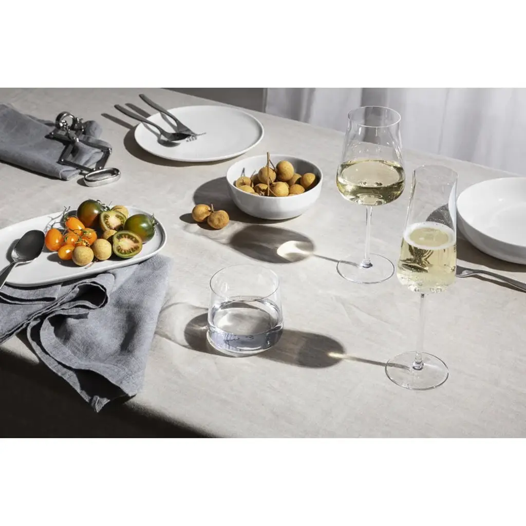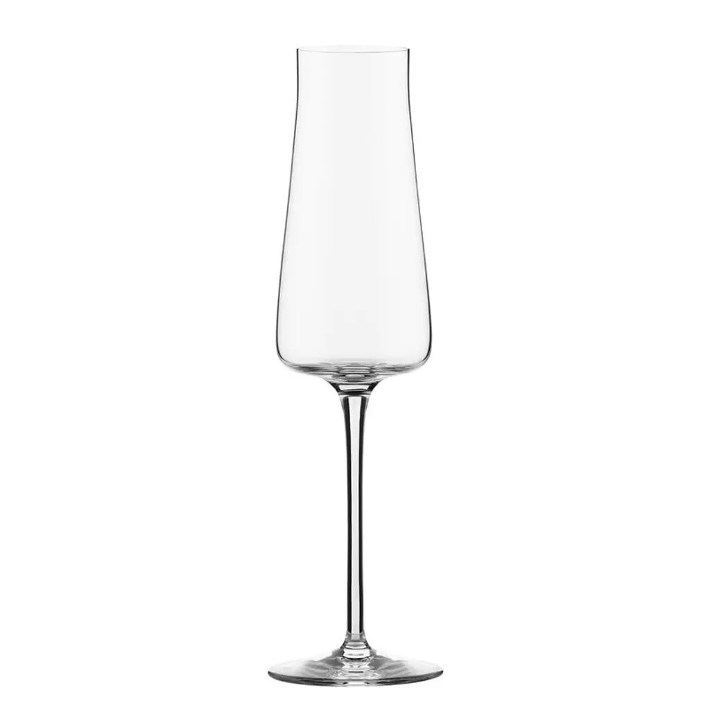 Alessi's Eugenia champagne flute is part of a glassware collection designed by Naoto Fukasawa, created to complement both everyday and special occasions. The champagne glass has a slightly downward flaring shape that, together with the softly contoured stem, creates a beautifully curved silhouette. Eugenia champagne flutes are sold in sets of four. The name of the Eugenia glass collection pays homage to Alberto Alessi's winery "La signora Eugenia e il passero solitario," translating to "Mrs. Eugenia and the Lonely Sparrow", and the shape of the winery's bottles served as a starting point for Naoto Fukasawa's design. Made from clear, lead-free crystalline glass, the Eugenia glassware features a clean, minimalist design, making it extremely versatile in any setting. The unifying feature of the glasses is their subtly obtuse angle, which gives each piece in the collection a slightly different yet recognizable shape.