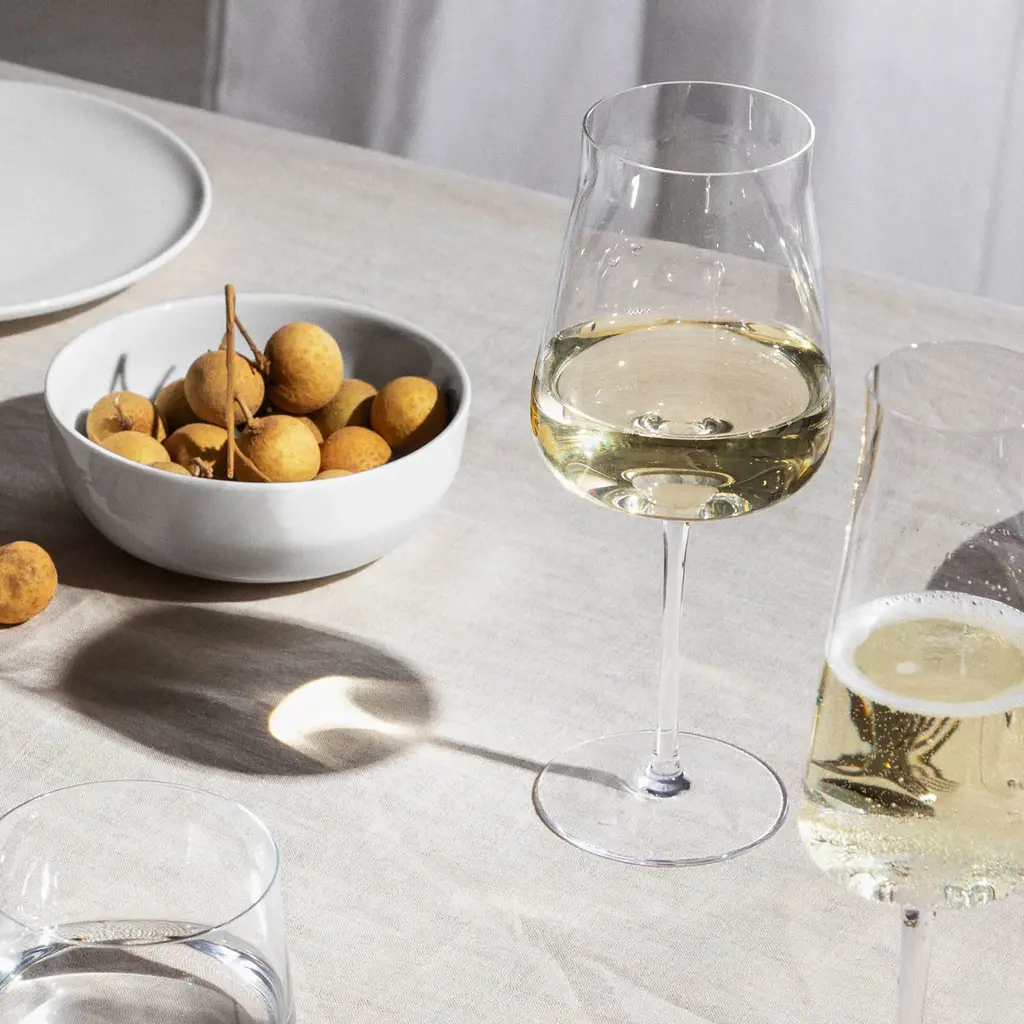 Designed by Naoto Fukasawa, the Eugenia White Wine Glass refines the experience of enjoying white wines with its carefully considered form. Inspired by the silhouette of wine bottles, the gently flared bowl allows aromas to develop, enhancing every sip. The ultra-thin stem and balanced proportions make it comfortable to hold, while the subtle angular lines give it a distinctive character. Lightweight yet durable, this set is crafted for both casual and formal settings. The clean, minimalist design pairs seamlessly with the other pieces in the Eugenia collection, including the matching red wine glass and decanter. Whether for everyday use or special occasions, this glass brings a thoughtful approach to modern table settings.