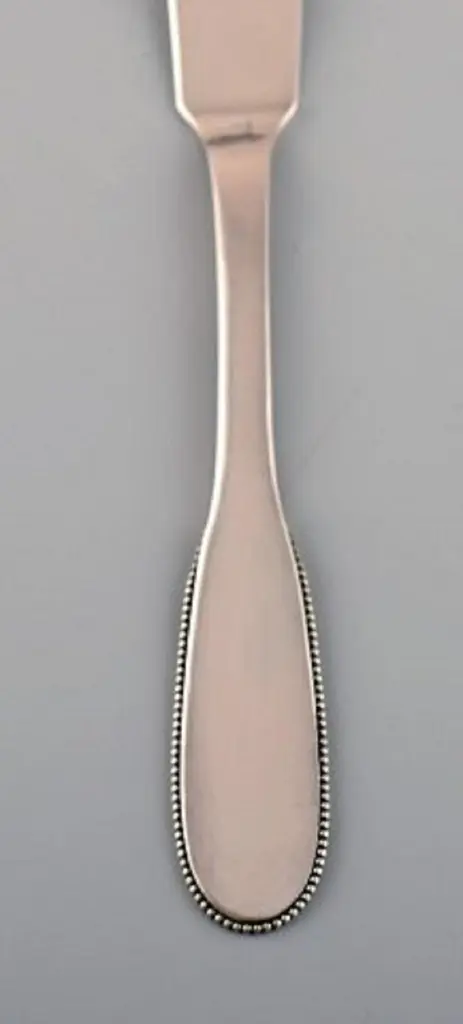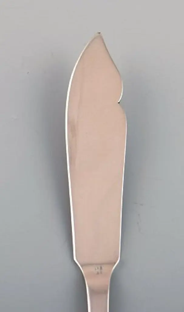 Evald Nielsen number 14 fish knife in hammered silver, 1920s.Ten knives are available.Stamped.In excellent condition.Our skilled Georg Jensen silversmith / goldsmith can polish all silver and gold so that it looks like new. The price is very reasonable.