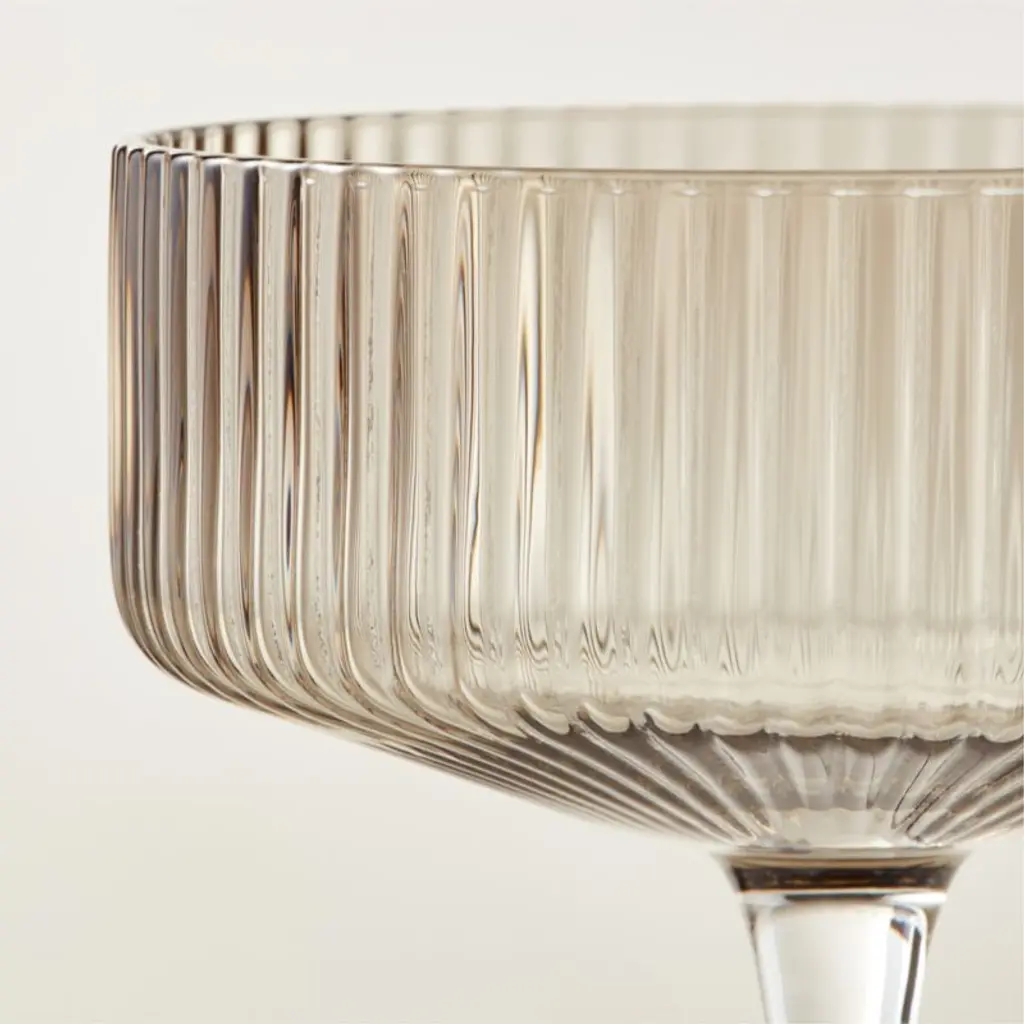 Our most popular cocktail glass in a smoky hue. The short, flat-rimmed Eve coupe features optic texture all around the glass. Makes the perfect moody cocktail glass or extra fancy dessert/parfait bowl. The smokey hue may feature slight variation due to the nature of the production of the glass. CB2 exclusive.