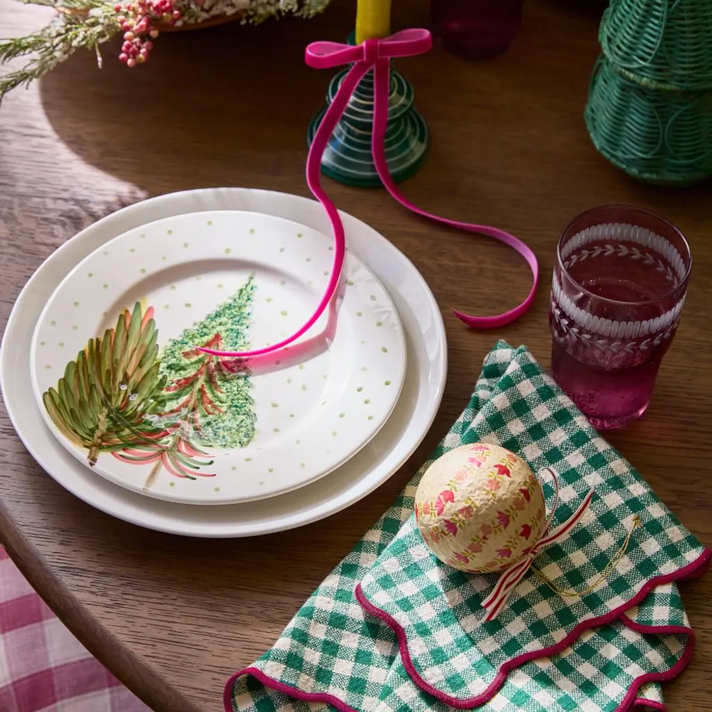 Hand-painted for your holiday table. Decorated with pines and dots on 100% earthenware, these small plates let you set an evergreen table that’s entirely unique.