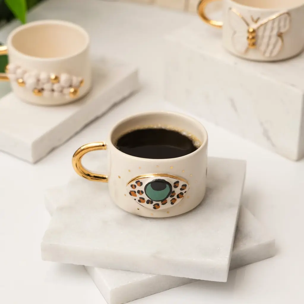Embrace a touch of mysticism and protection with the Leopard Nazar Eye Mug. Featuring a captivating eye symbol with a bold leopard print design, this mug combines modern style with the ancient symbolism of the evil eye, believed to ward off negative energy. The golden handle adds a luxurious feel, while the protective Nazar motif brings a sense of safety and charm to your everyday moments. Perfect as a thoughtful gift or for enjoying your favorite seasonal drinks, this mug is both a trendy and meaningful addition to your holiday collection.