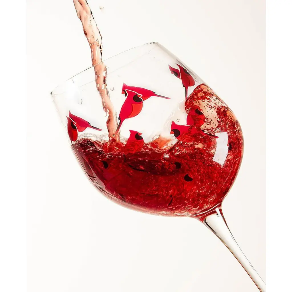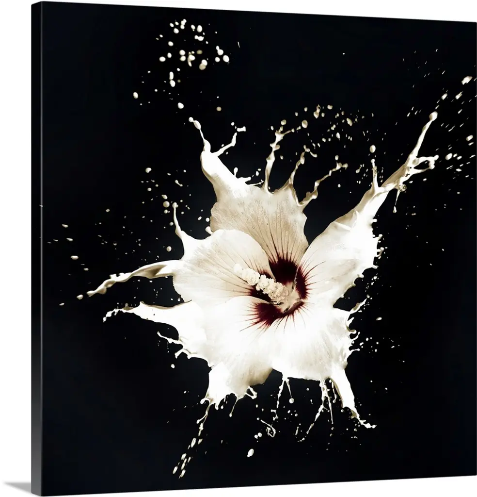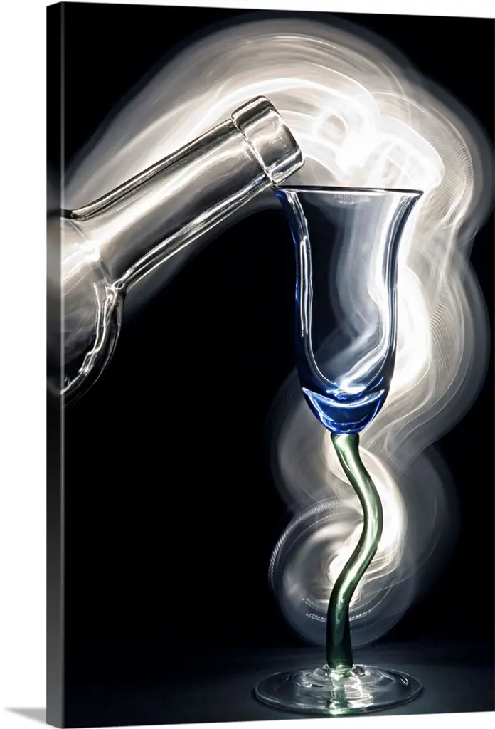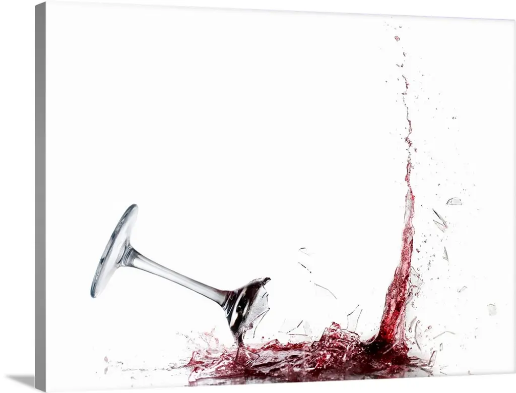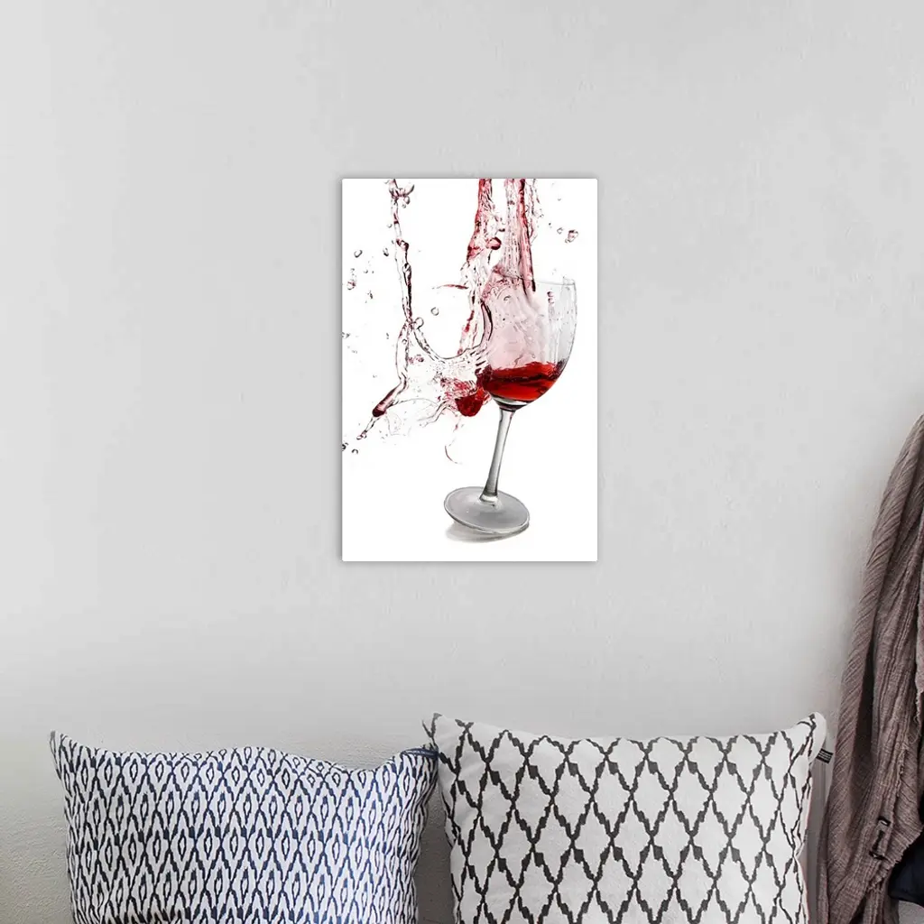 Portrait photograph on a large wall hanging of a slightly tilted glass of red wine, the goblet appears to be exploding and wine is leaving the glass in all directions.