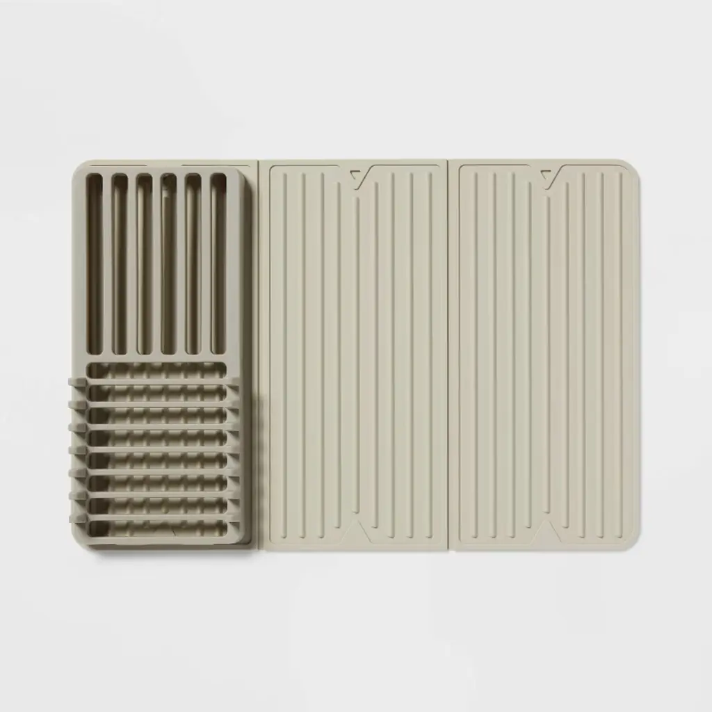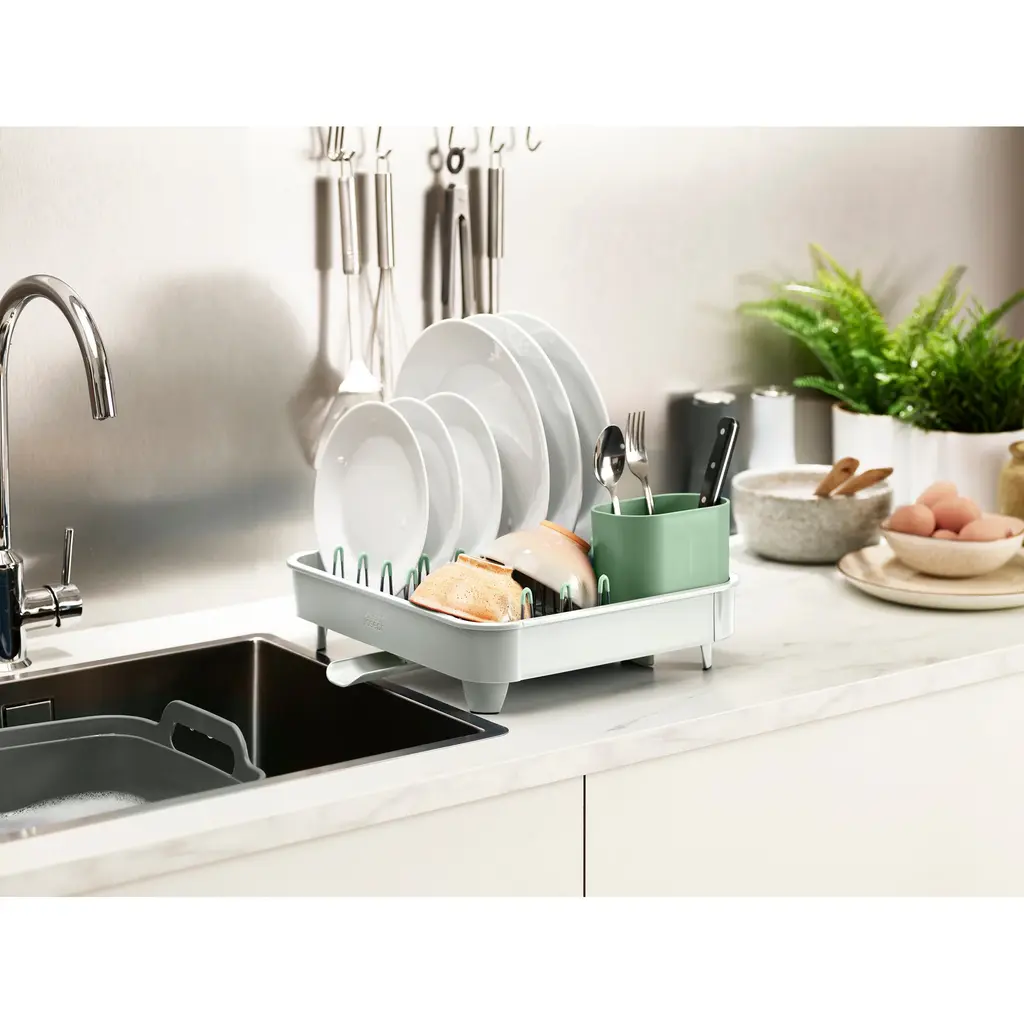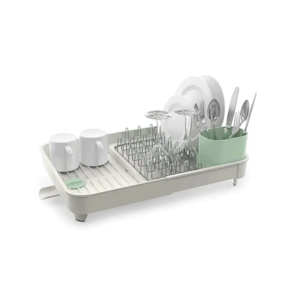 We created Extend to make doing the dishes a much easier task. Our expandable dish drainer extends to twice its size to fit more items. It also has a movable spout to drain water, a dedicated draining space for cutlery and raised ribs that prevent water from becoming trapped under glasses and bowls.