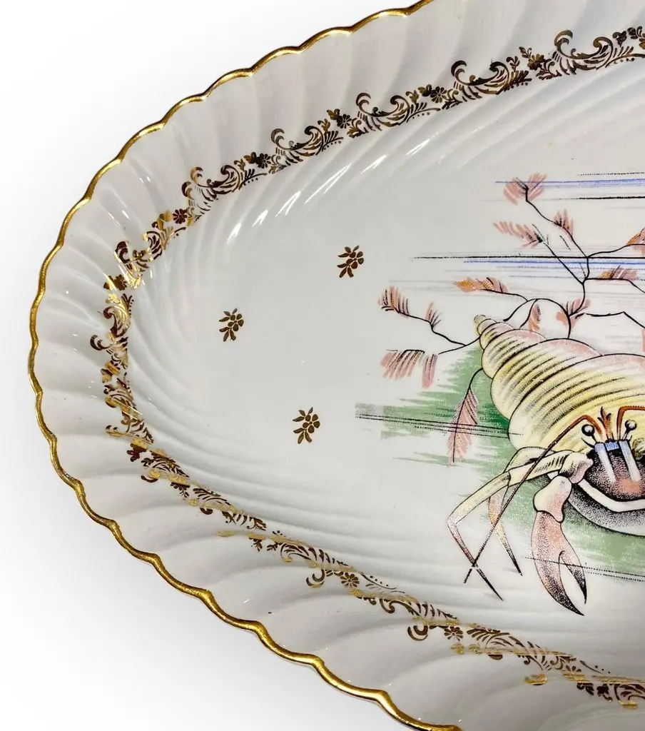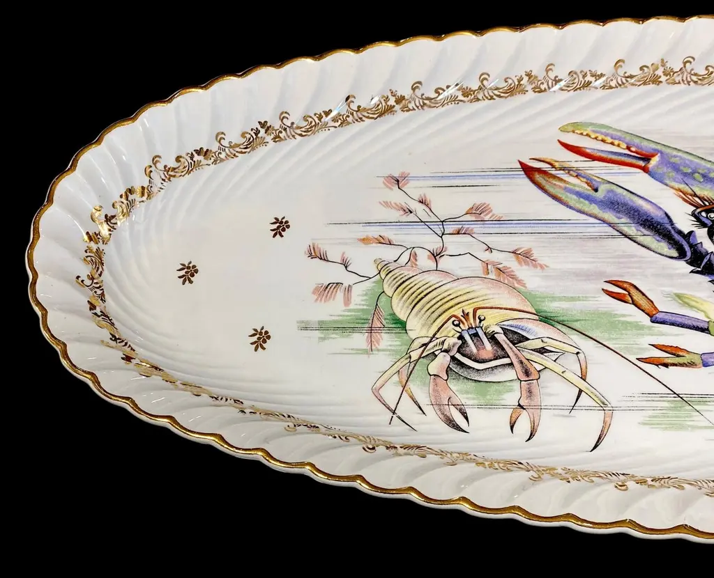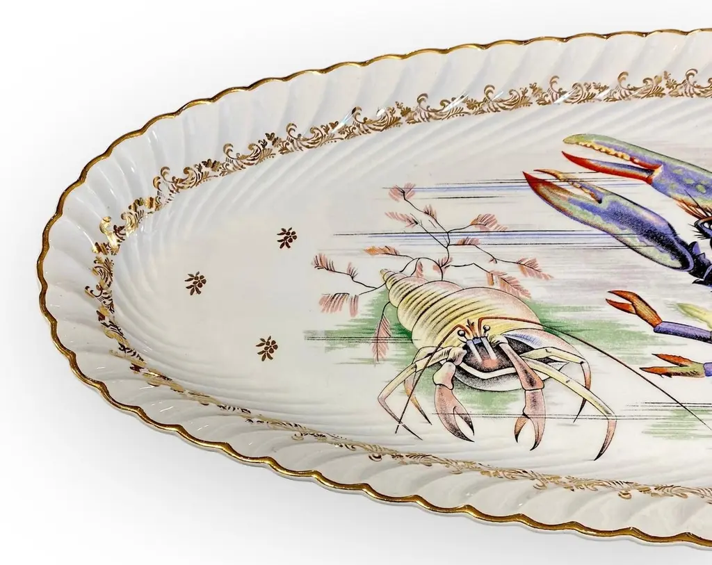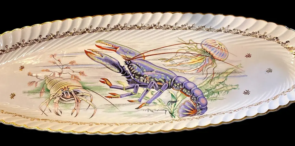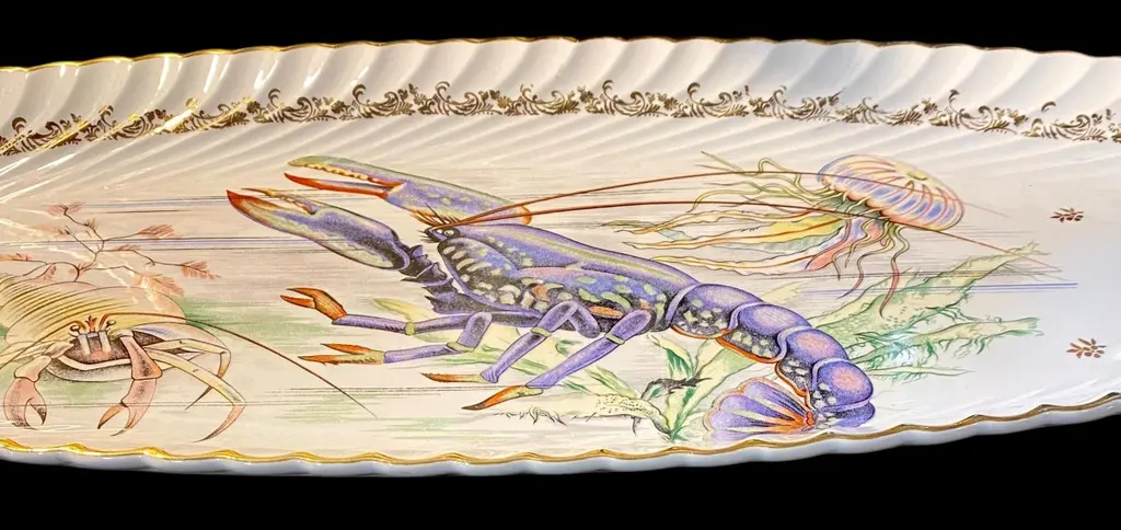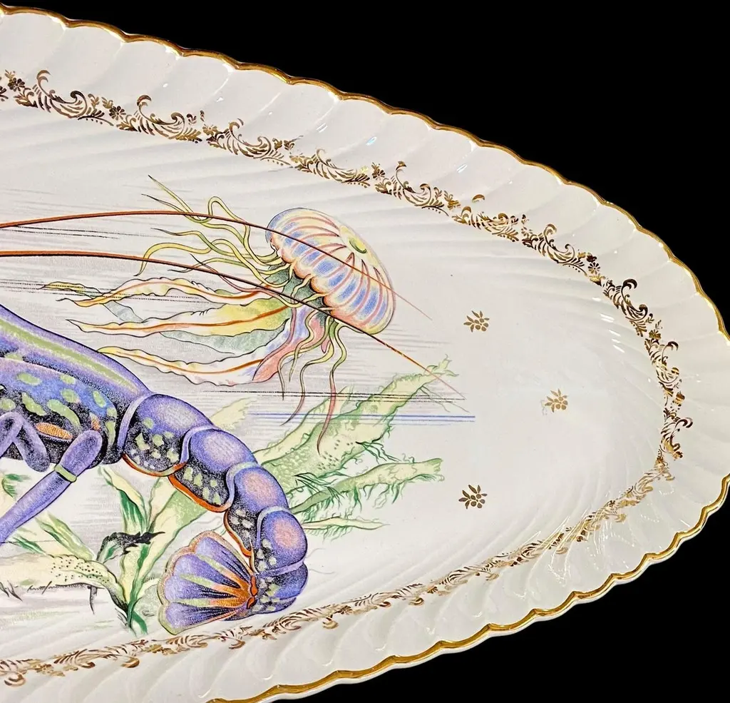 An extra long vintage French porcelain seafood platter. fish serving platter, deep sided, so that the fish can be served with sauces and dressings, without risk of spillage.The motif is the most detailed illustration of a rare blue lobster, jellyfish and hermit crab.It is a magnificent platter, perfect for a seafood banquet.This would make an ideal table centerpiece for serving a beautifully prepared lobster, trout, salmon or other fish. It would also be a wonderful party or buffet piece, for serving stylish canapés and nibbles, to add elegance to your setting. It is ideal for large catering events such as weddings, banquets and big family gatherings. It looks so impressively stunning it will be a real "talking point".