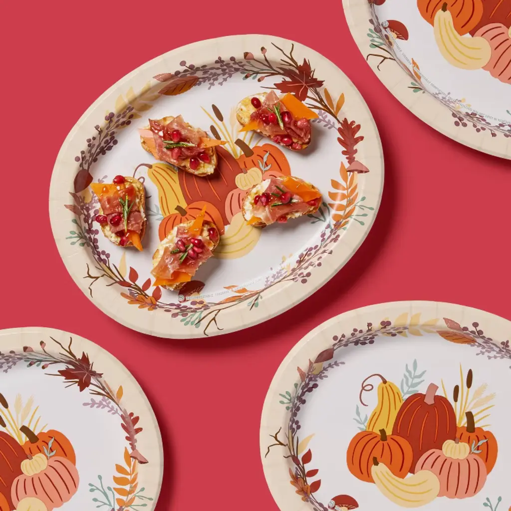 Stock your party supplies for Halloween and beyond with these 16-Count Fall Disposable Platters from up&up™. Made of paper, these platters feature autumn-themed icons to elevate your seasonal feasts. Designed in a round shape, these platters are also microwave safe for easy reheating of the food. up&up™: We believe making smart choices for the people, places, and pets in your life should be easy and affordable. And, having quality you can trust should be a given. That’s why you can count on our promise – caring for your everyday in every way.Satisfaction guaranteed – Love it or your money back.