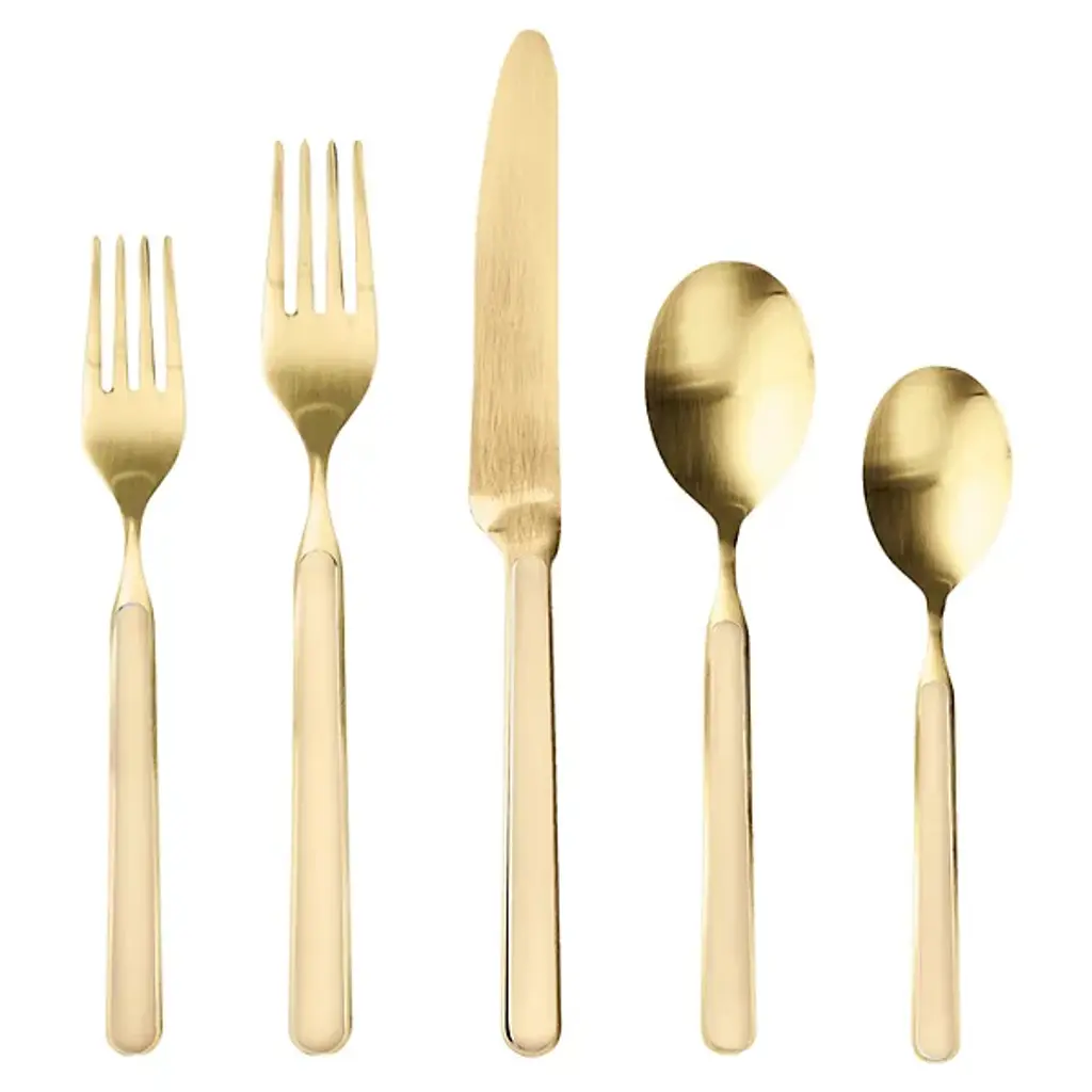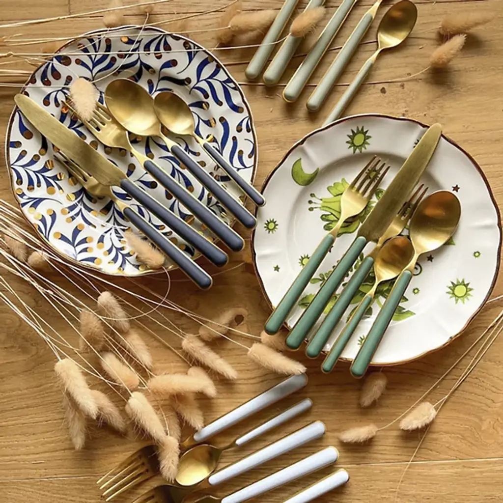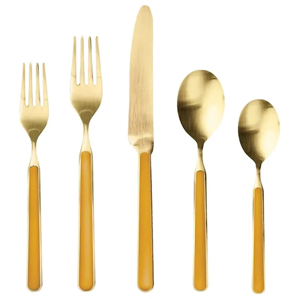 The Fantasia Ice Gold 20-Piece Flatware Set offers an exceptional fusion of modern design and practicality. Expertly crafted in Italy, this luxurious set is made from premium 18/10 stainless steel combined with durable resin, ensuring both strength and beauty. Its sleek, contemporary design adds a sophisticated touch to any dining setting, enhancing your overall dining experience. Dishwasher safe for convenience, this set combines elegance with functionality, making it the perfect addition to elevate your table with style.
