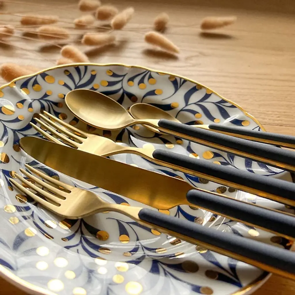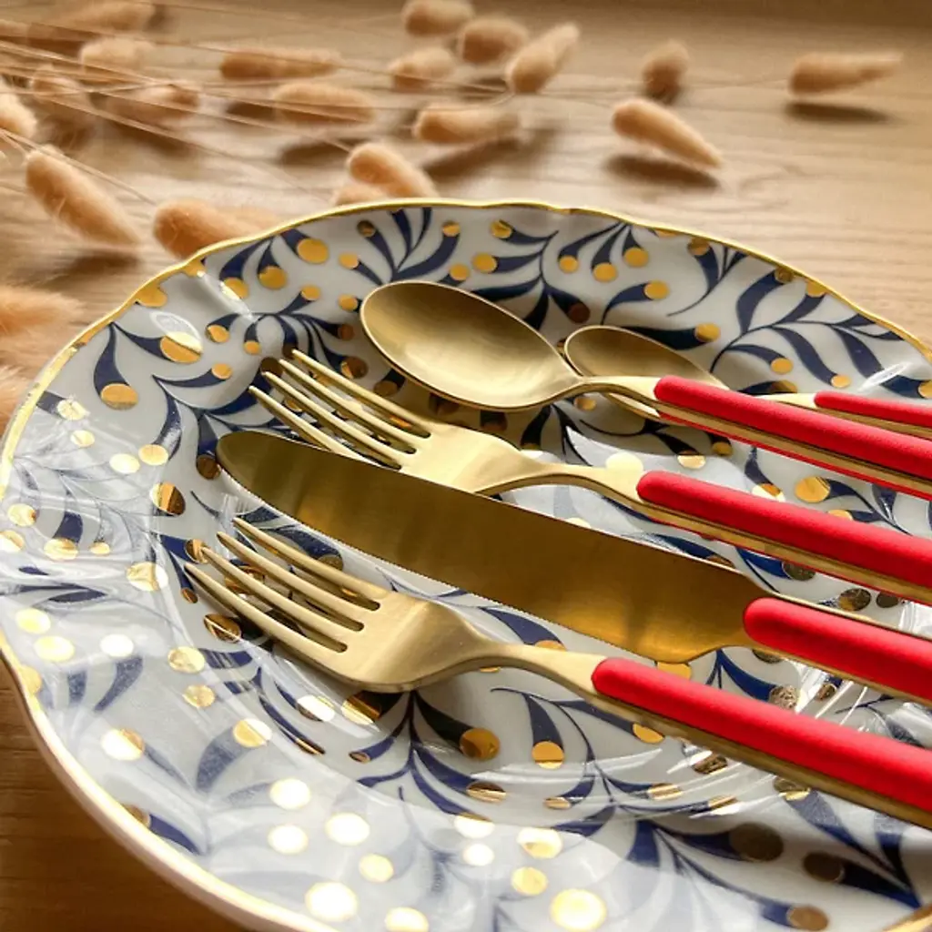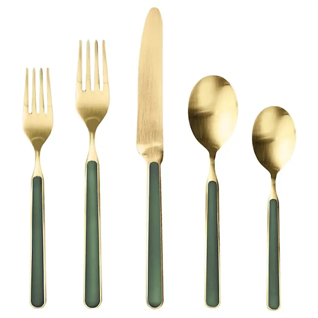 The Fantasia Ice Gold 20-Piece Flatware Set offers an exceptional fusion of modern design and practicality. Expertly crafted in Italy, this luxurious set is made from premium 18/10 stainless steel combined with durable resin, ensuring both strength and beauty. Its sleek, contemporary design adds a sophisticated touch to any dining setting, enhancing your overall dining experience. Dishwasher safe for convenience, this set combines elegance with functionality, making it the perfect addition to elevate your table with style.