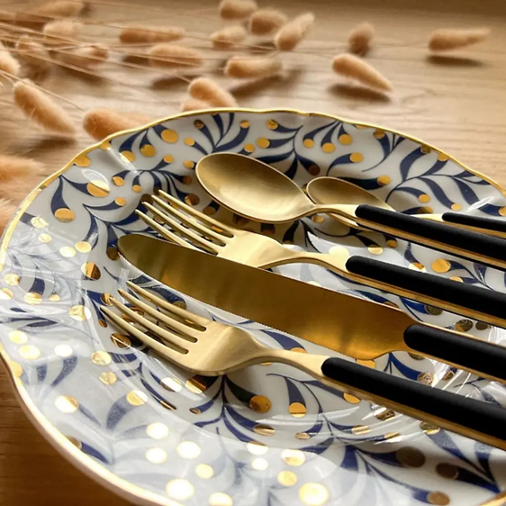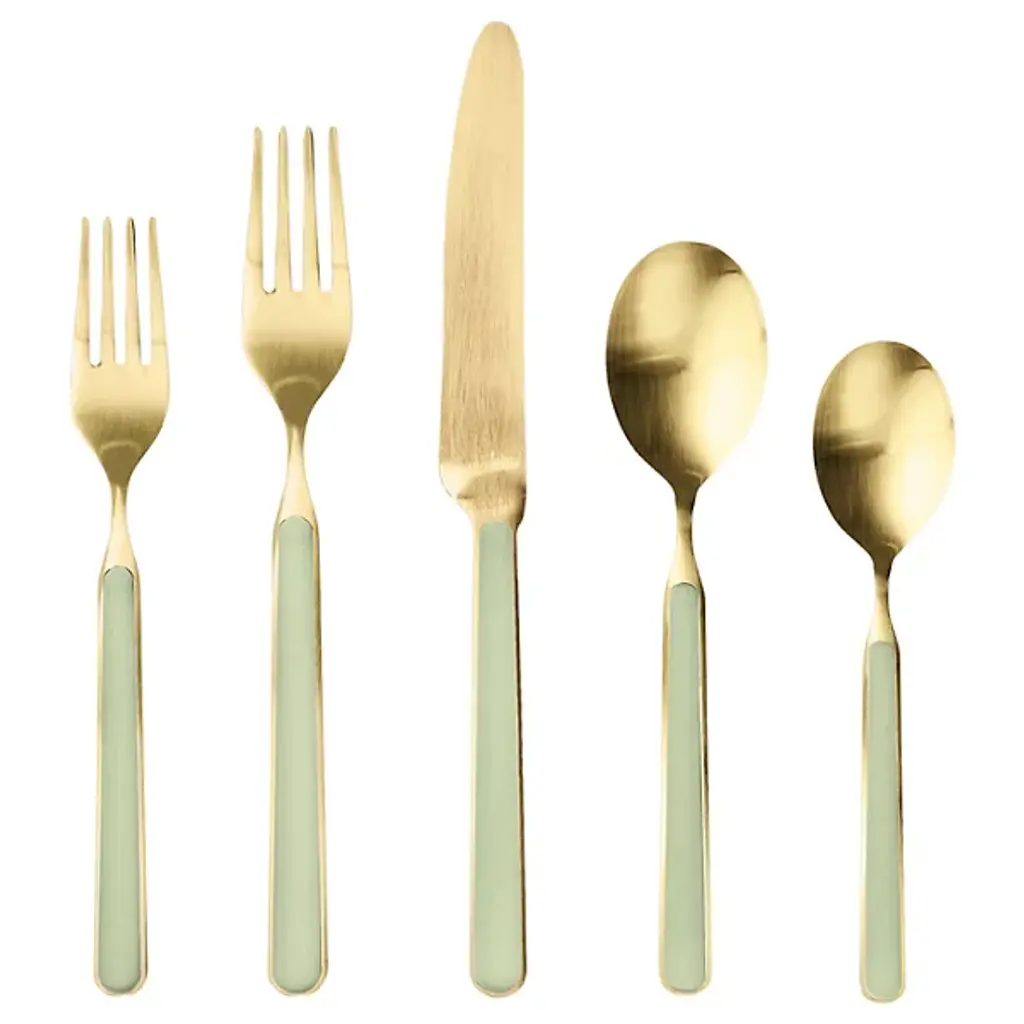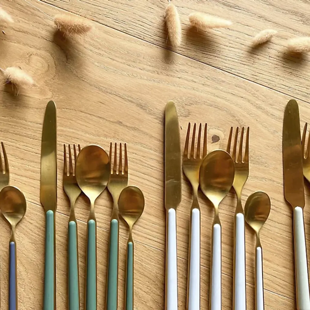 The Fantasia Ice Gold 20-Piece Flatware Set offers an exceptional fusion of modern design and practicality. Expertly crafted in Italy, this luxurious set is made from premium 18/10 stainless steel combined with durable resin, ensuring both strength and beauty. Its sleek, contemporary design adds a sophisticated touch to any dining setting, enhancing your overall dining experience. Dishwasher safe for convenience, this set combines elegance with functionality, making it the perfect addition to elevate your table with style.
