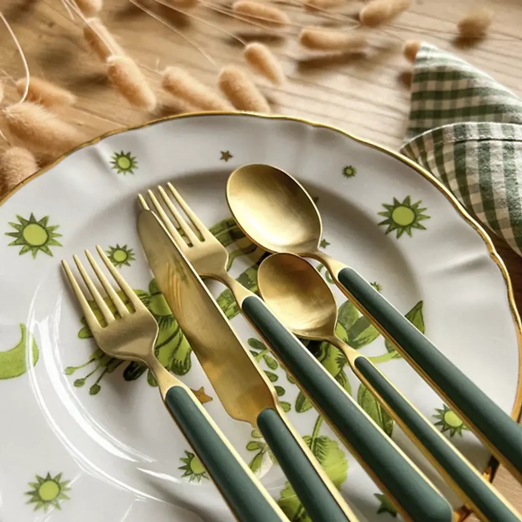 The Fantasia Ice Gold 20-Piece Flatware Set offers an exceptional fusion of modern design and practicality. Expertly crafted in Italy, this luxurious set is made from premium 18/10 stainless steel combined with durable resin, ensuring both strength and beauty. Its sleek, contemporary design adds a sophisticated touch to any dining setting, enhancing your overall dining experience. Dishwasher safe for convenience, this set combines elegance with functionality, making it the perfect addition to elevate your table with style.
