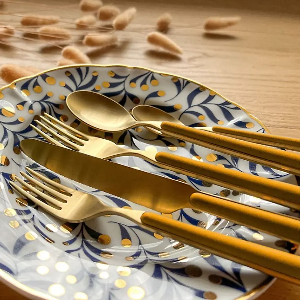 The Fantasia Ice Gold 20-Piece Flatware Set offers an exceptional fusion of modern design and practicality. Expertly crafted in Italy, this luxurious set is made from premium 18/10 stainless steel combined with durable resin, ensuring both strength and beauty. Its sleek, contemporary design adds a sophisticated touch to any dining setting, enhancing your overall dining experience. Dishwasher safe for convenience, this set combines elegance with functionality, making it the perfect addition to elevate your table with style.