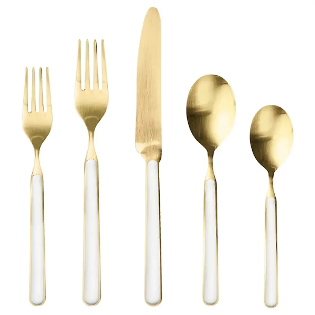The Fantasia Ice Gold 20-Piece Flatware Set offers an exceptional fusion of modern design and practicality. Expertly crafted in Italy, this luxurious set is made from premium 18/10 stainless steel combined with durable resin, ensuring both strength and beauty. Its sleek, contemporary design adds a sophisticated touch to any dining setting, enhancing your overall dining experience. Dishwasher safe for convenience, this set combines elegance with functionality, making it the perfect addition to elevate your table with style.