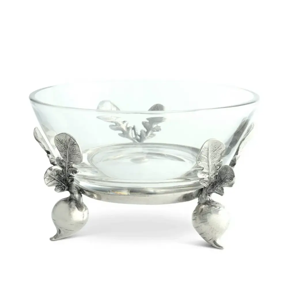 Our Radish Dip Bowls feature a slightly sloped, heavy glass bowl resting upon realistically detailed pewter radish 'feet', further embellished with sprightly radish tops Bowls are available in 2 sizes, 3 cups and 1.5 cup capacity. A showcase for your creative culinary skills, the bowls are excellent for serving spicy salsas, creamy dips and tasty tidbits Vagabond House is a family-owned American company specializing in fine pewter tableware, servingware and giftware. Largely inspired by nature, their exclusive products are designed to be unique, functional heirlooms for those who seek to express tradition and style in both family and formal entertaining.