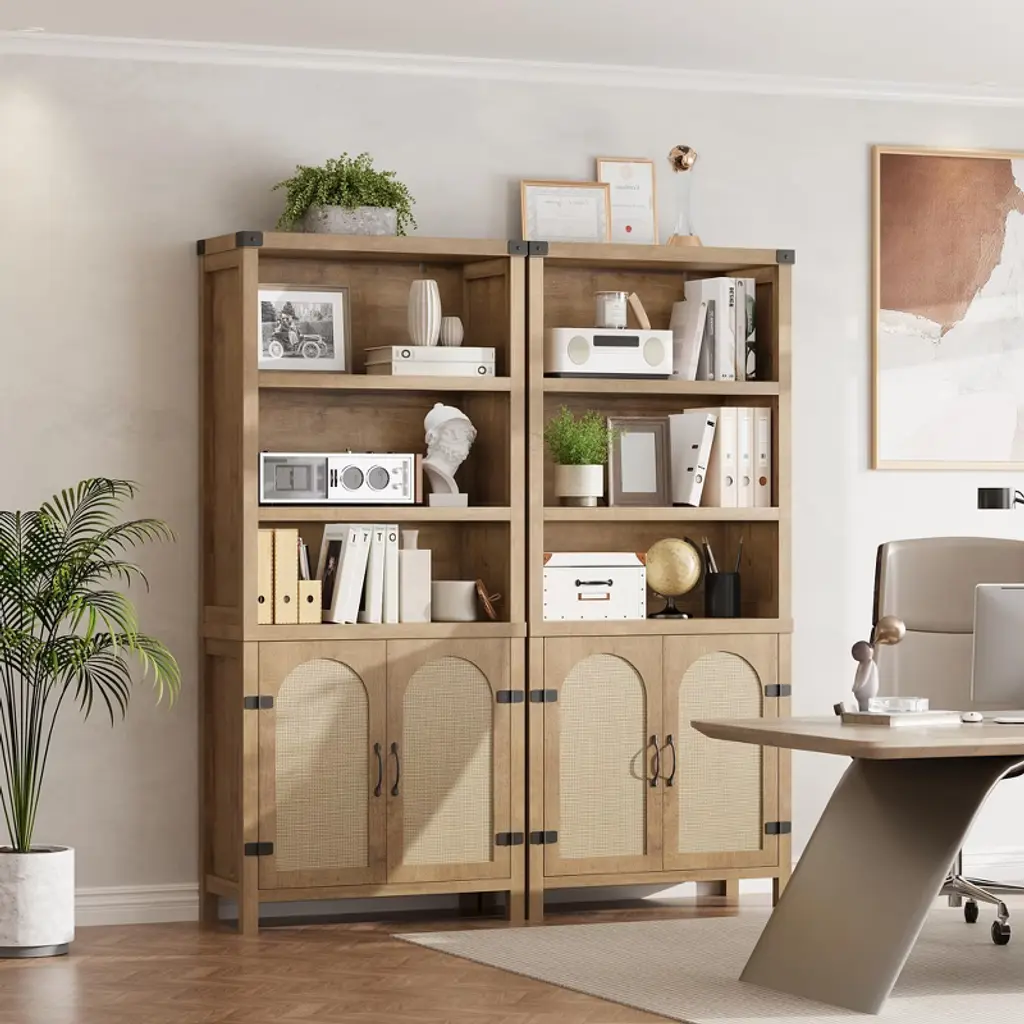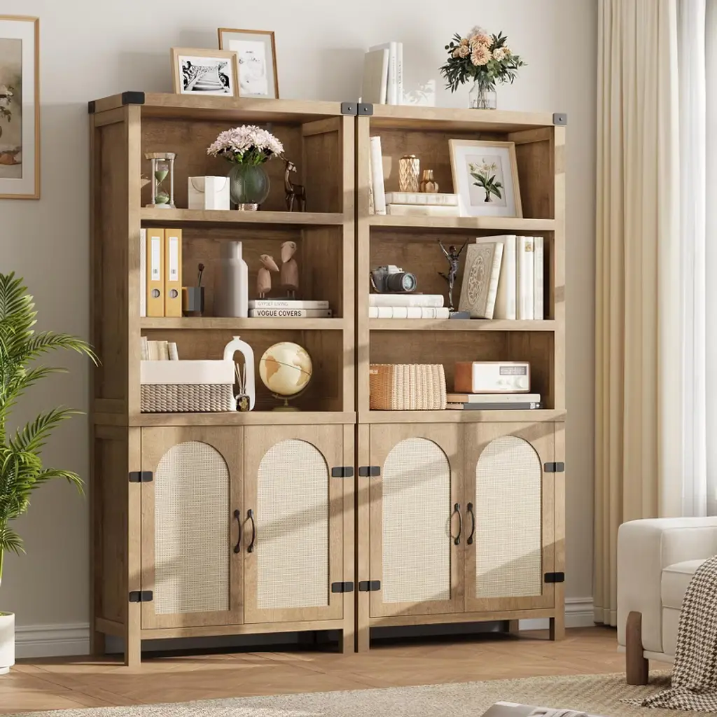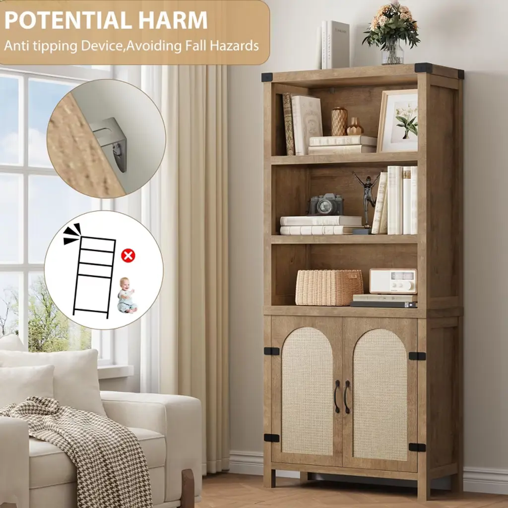 Farmhouse Bookshelves With Rattan Doors, 70" Tall Cutlery Shelves With Three Tiers Of Open Storage, Floor Standing Display Shelves, Bookcases For Home