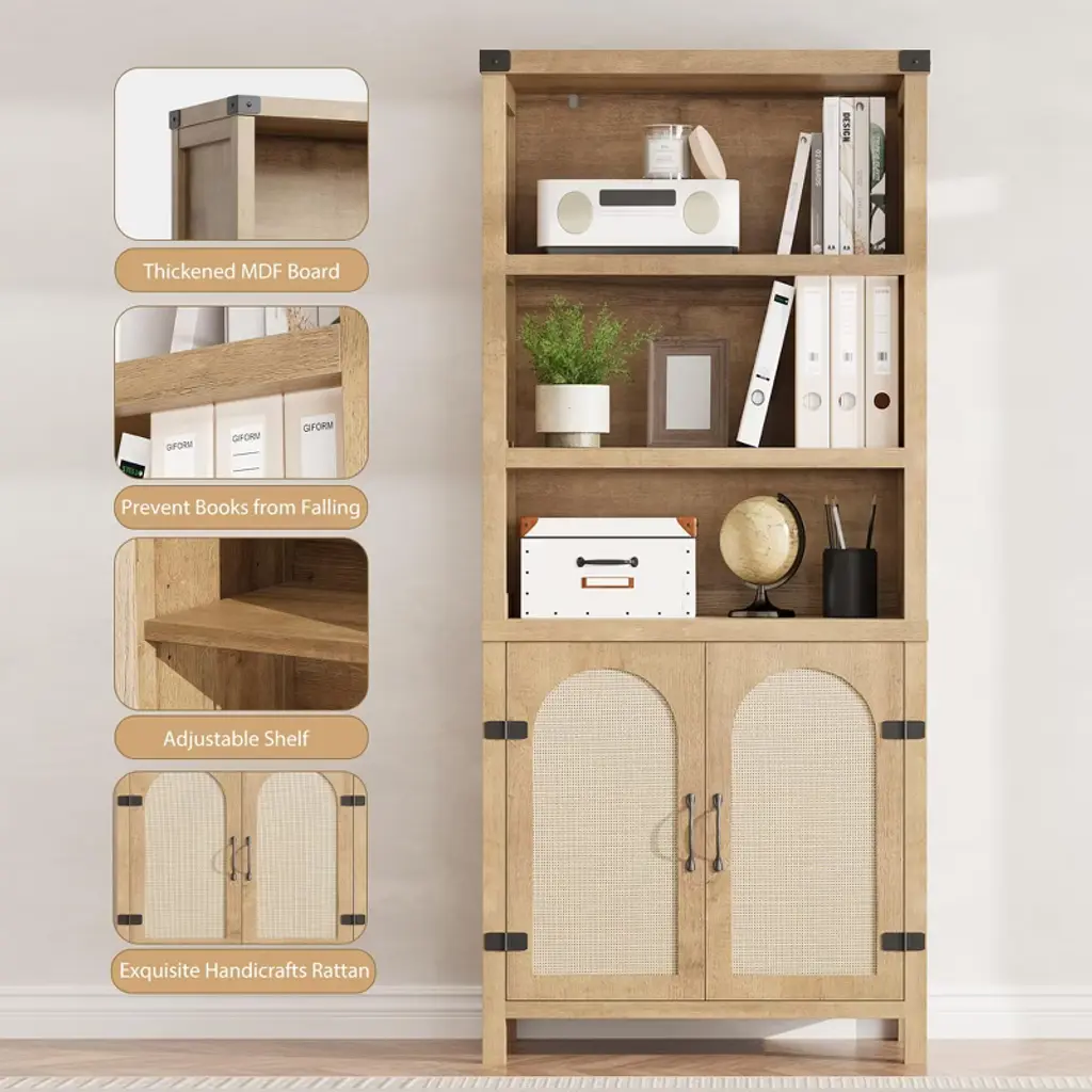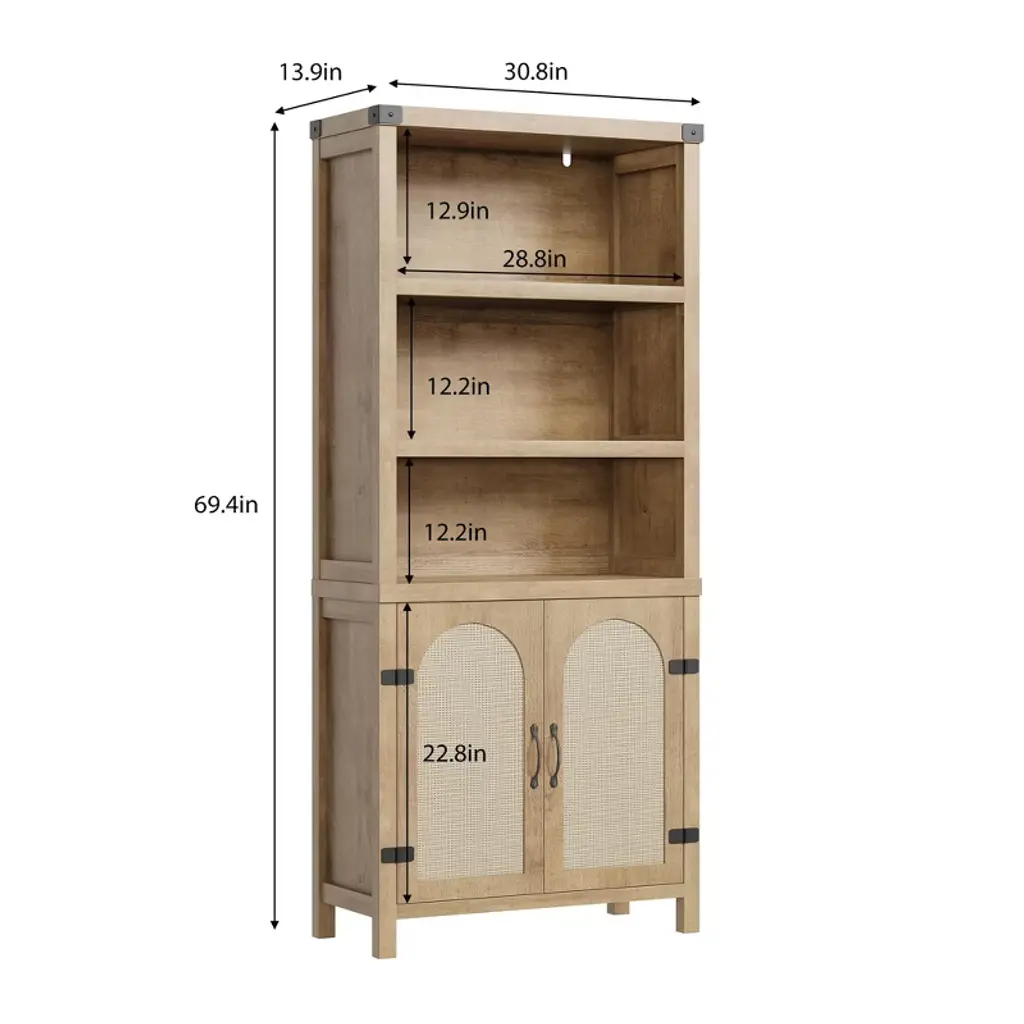 Farmhouse Bookshelf with Rattan Doors ¨C 70" Tall 3-Tier Display Shelf, Rustic Cutlery Storage & Bookcase for Living Room or BedroomBrand: TROPOWMaterial: Premium MDF + Woven RattanStyle: Rustic FarmhouseDimensions: 30.8"W x 13.9"D x 69.4"HWeight Capacity: 350 lbs (Total)Shelves: 3 Adjustable Open Shelves + 1 Rattan-Door CabinetSpecial Features: Anti-Tip Hardware Included Stain-Resistant Melamine Finish Hand-Polished Wood DetailingAssembly: Required (<1 Hour) PRODUCT HIGHLIGHTSRUSTIC CHARM, MODERN FUNCTION Woven rattan doors ¨C Add organic texture Hand-polished surfaces ¨C Highlight wood grain Farmhouse silhouette ¨C Fits rustic to modern decor SMART STORAGE? 3 adjustable shelves ¨C Customize for books/decor? Closed cabinet ¨C Hide clutter behind rattan? Slim 13.9" depth ¨C Saves space in small roomsDURABLE & SAFE 350 lb capacity ¨C Thickened MDF construction Anti-tip kit ¨C Child/pet-proof stability Easy-clean surface ¨C Wipe with damp cloth VERSATILE PLACEMENT? Living room ¨C Book & decor display? Dining area ¨C Cutlery or dishware storage? Bedroom ¨C Nightstand alternativeEASY ASSEMBLY All tools included Clear instructions <1 hour setup WHY CHOOSE THIS BOOKSHELF?? Farmhouse Elegance ¨C Rattan + wood grain? Flexible Organization ¨C Open & closed storage? Space-Saving ¨C Fits narrow spaces? Heavy-Duty ¨C Holds 350 lbsPerfect For Storing: Book collections Dinnerware or barware Photo frames & plants