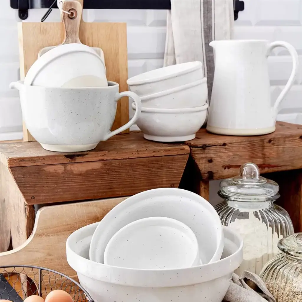 The quintessential farmhouse look is the foundation of the Fattoria collection. A variety of cooking and serveware pieces like bakers, mixing bowls, 3-size canisters, and generous pitchers… transport lovers of a traditional Italian kitchen look to a more contemporary approach without losing its inherent country charm. All Fattoria items are available in white, while a subset of pieces can be purchased in a pale grey.