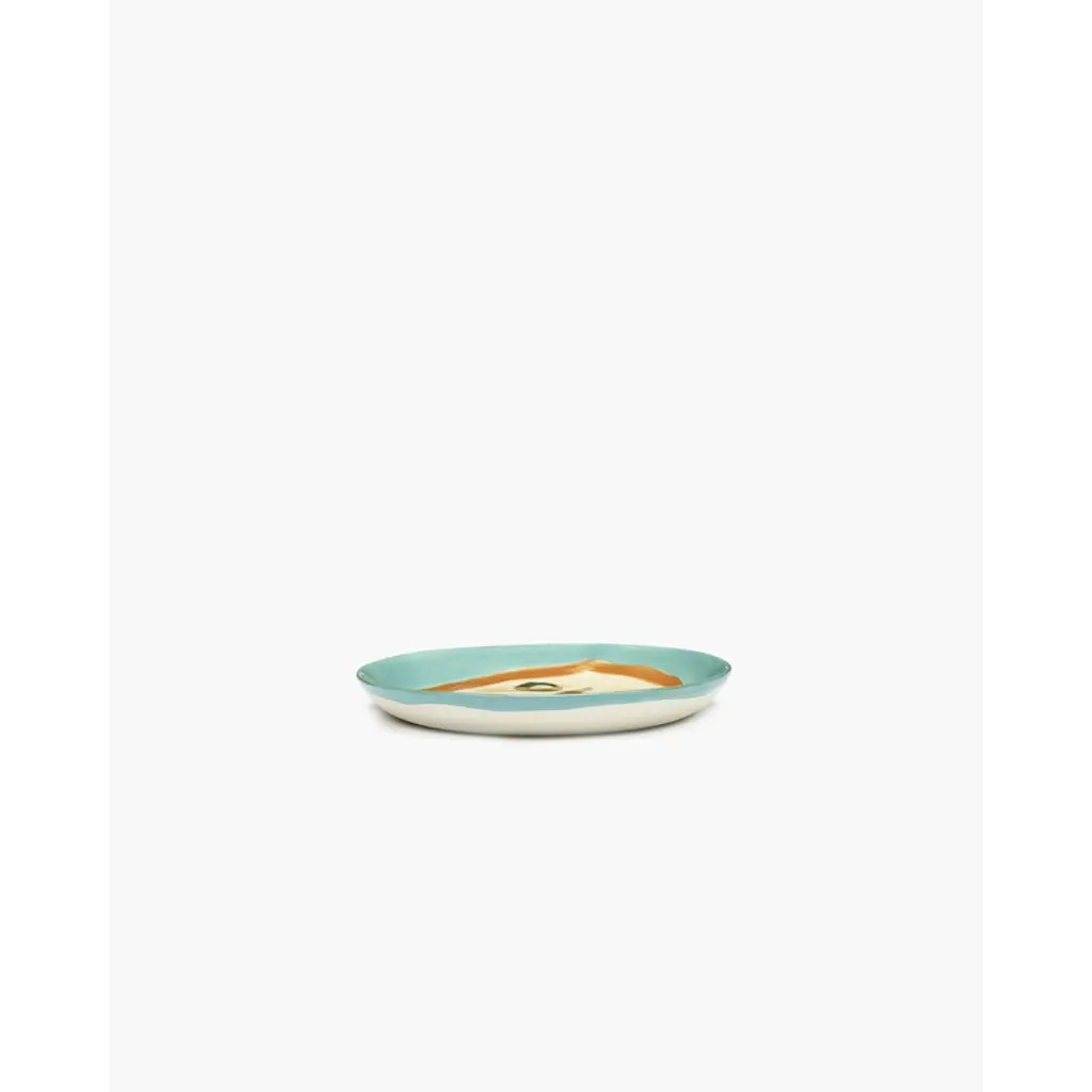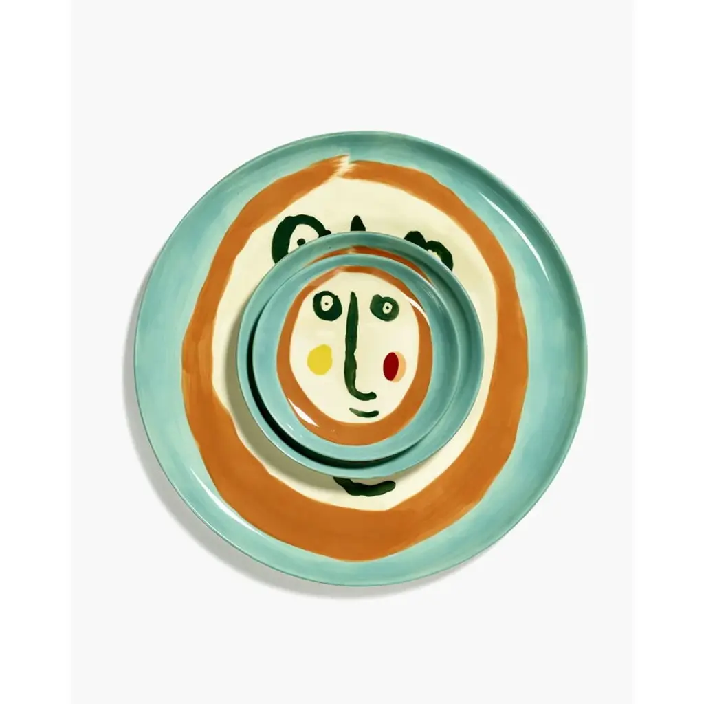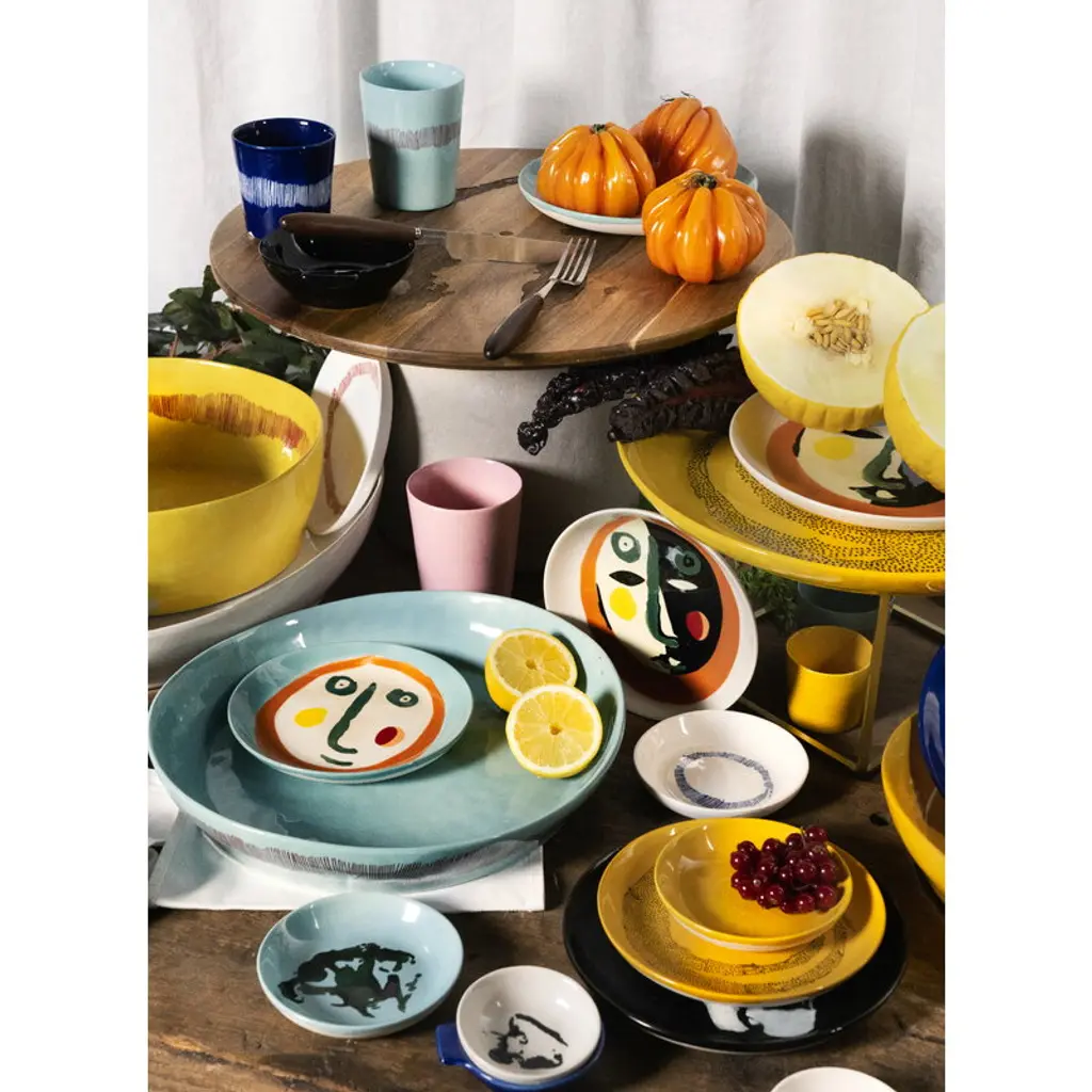 Serax's Feast serving plate is decorated with an abstract face, which appears to be either grinning happily or pondering a little bit dizzy – the meaning of the expression depends entirely on the viewer! The playful plate is ideal for serving sweets, nuts, fruit and other small snacks. The pack contains four little plates. The Feast dishware celebrates cheerful colors and positivity: it is created for gatherings with friends and family. Designed by Yotam Ottolenghi in collaboration with Italian artist Ivo Bisignano, the expressive tableware set includes plates, bowls, cups and serving dishes of different sizes and colors – something for every meal. The dishware can be mixed and matched but looks beautiful as individual pieces, too.