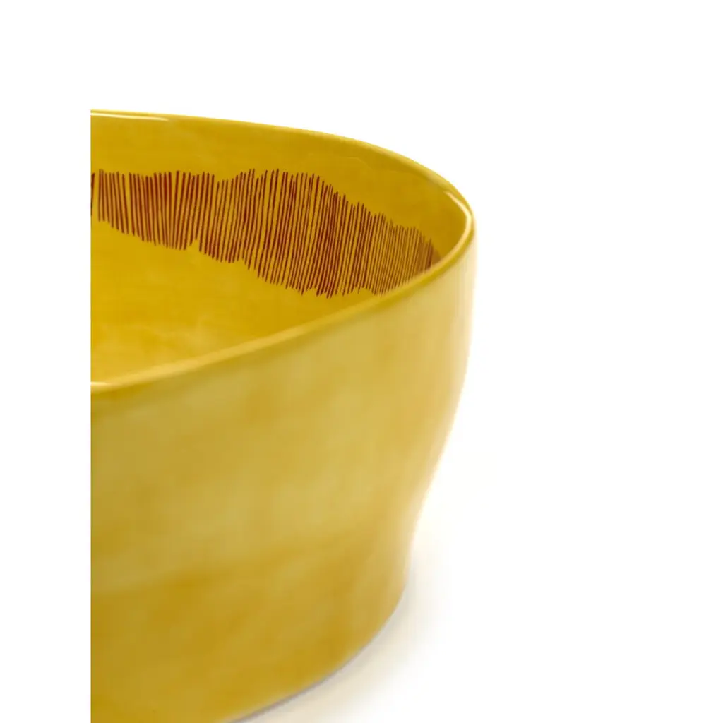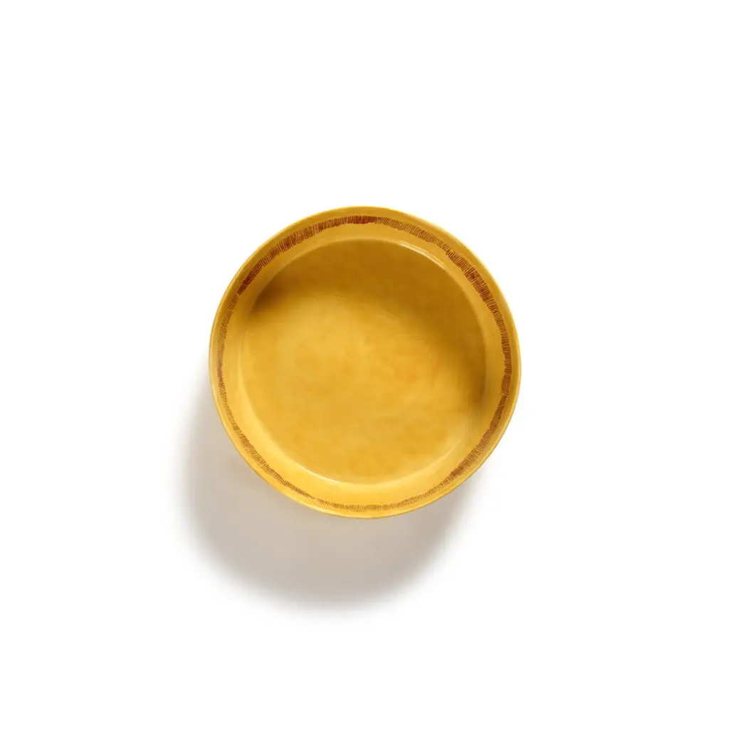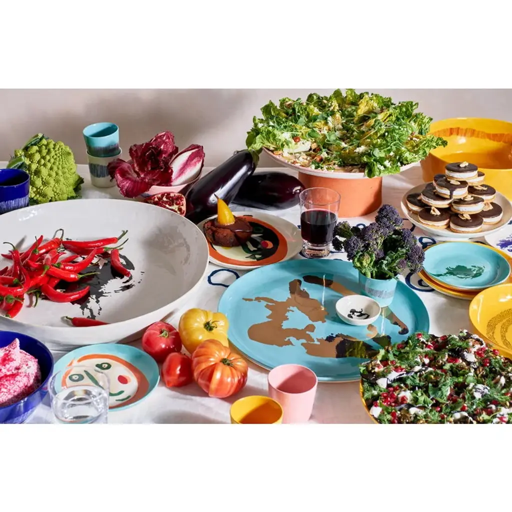 Serax's Feast salad bowl is decorated with a beautiful deep yellow color and a circular pattern made of white lines of different lengths and thicknesses. The charming bowl is ideal for serving salads, pasta, sauces and other dishes, but can also be used as a deep plate on the dinner table. Outside the kitchen, the bowl is the perfect place to store cosmetics, jewelry and other small treasures. The Feast dishware celebrates cheerful colors and positivity: it is created for gatherings with friends and family. Designed by Yotam Ottolenghi in collaboration with Italian artist Ivo Bisignano, the expressive tableware set includes plates, bowls, cups and serving dishes of different sizes and colors – something for every meal. The dishware can be mixed and matched, but also look beautiful as individual pieces.