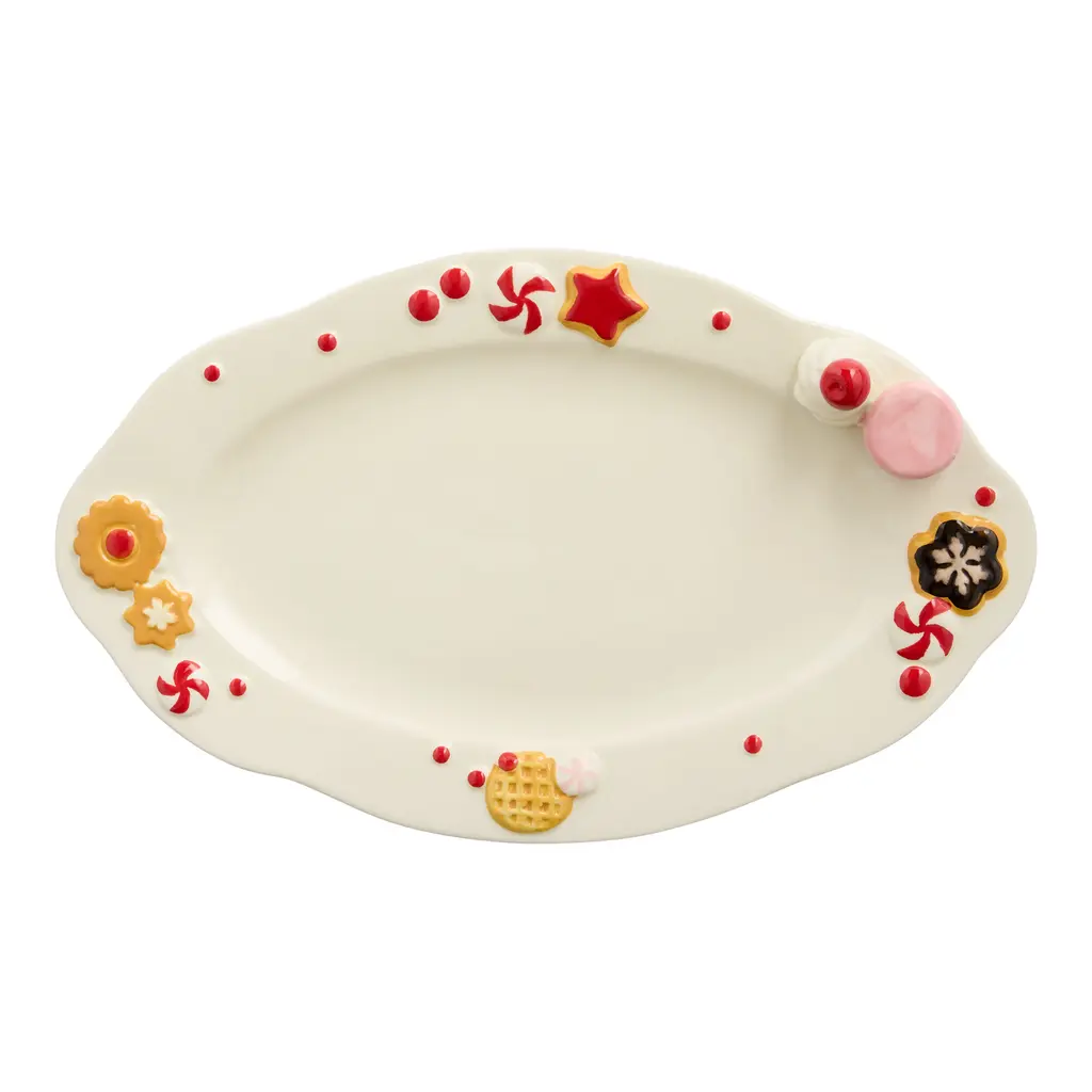Whipped up with festive flair, our hand-painted platter is perfect for piling high with seasonal baked goods and special cookies for Santa. The oval silhouette is adorned with an embossed stroopwafel, macaron, peppermints, and more sweet surprises sprinkled along the shapely rim. Explore our World Market Christmas shop for all things gifting, decor, entertaining, and more.