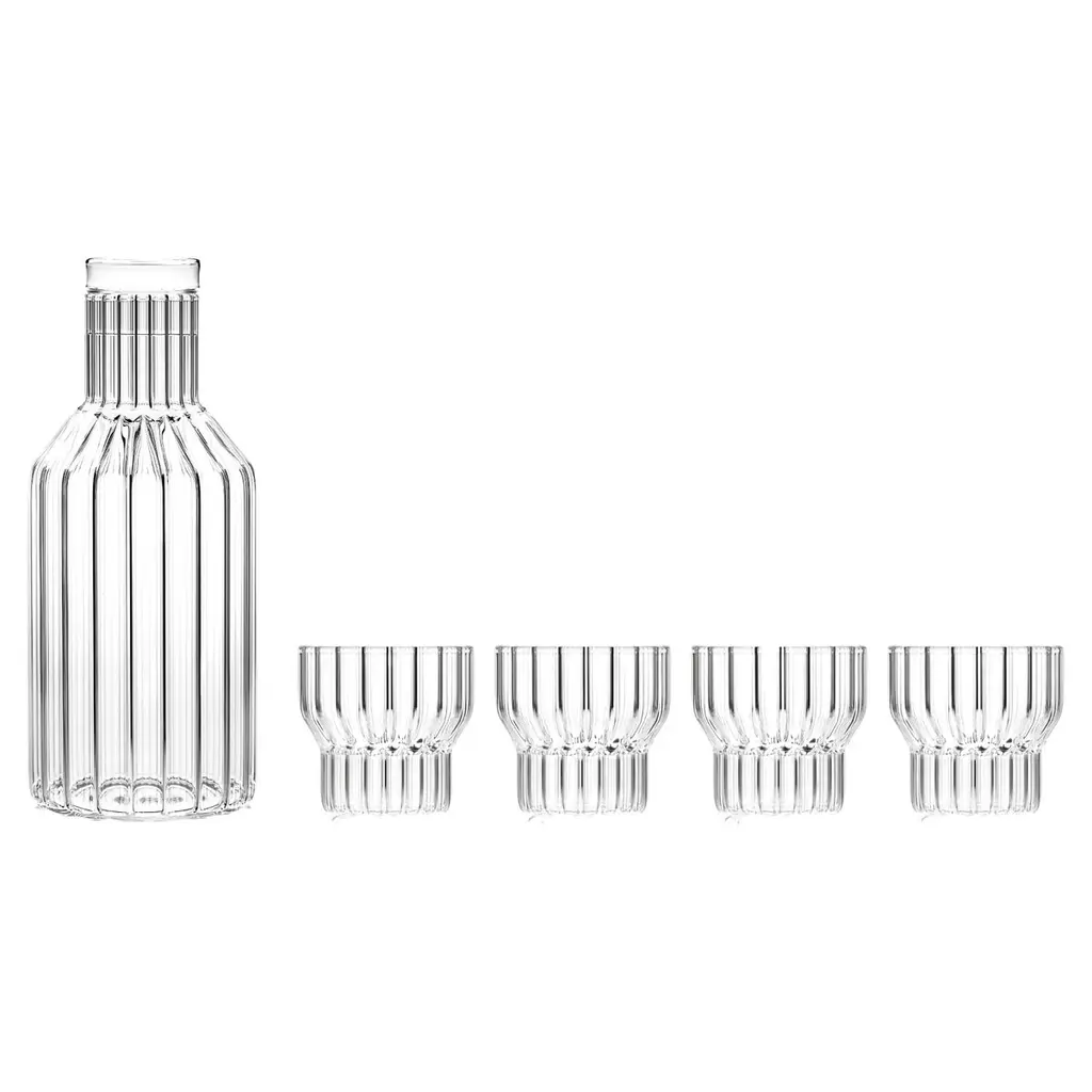 Margot Decanter and eight Dearborn Liqueur Shot Mini clear glass setEntirely hand-formed without the use of molds, the contemporary minimal Margot Decanter is an ideal companion to any evening spent enjoying your favorite port, scotch, bourbon, or other liqueur. With its timeless elegance the decanter promises to be a winsome addition to your bar, and pairs well with Dearborn Liqueur Shot Glasses, also handcrafted by master glassblowers of fluted Borosilicate glass. In stock and available now.Margot decantermaterial borosilicate glasssize900 mL (30 fl oz)H. 27 cm (10 3/4in) ø10cmDesign: Felicia Ferrone, 2016Handcrafted in Czech Republic Dearborn Liqueur Shot Glasses (set of eight)material borosilicate glasssize60 mL (2 fl oz)H. 6.5 cm (2 1/2in) ø4cmDesign: Felicia Ferrone, 2014Handcrafted in Czech Republic.