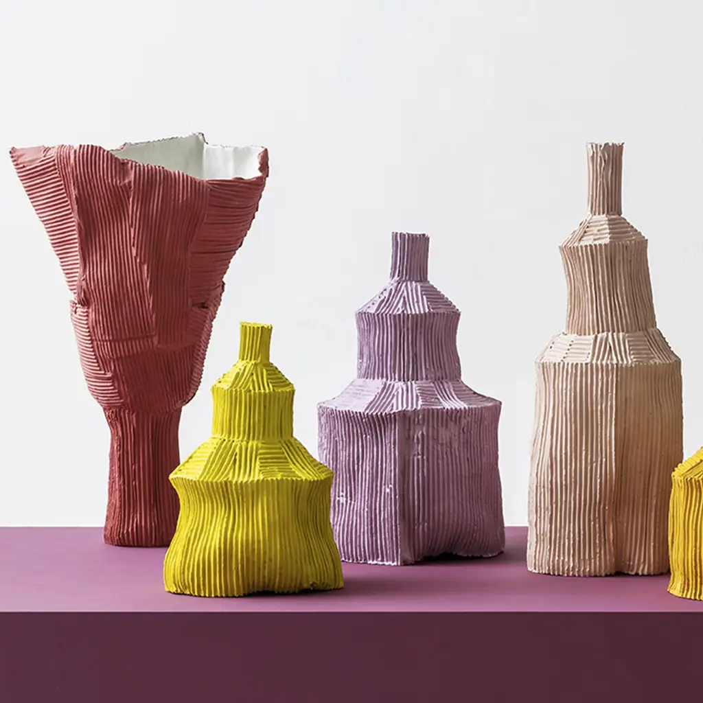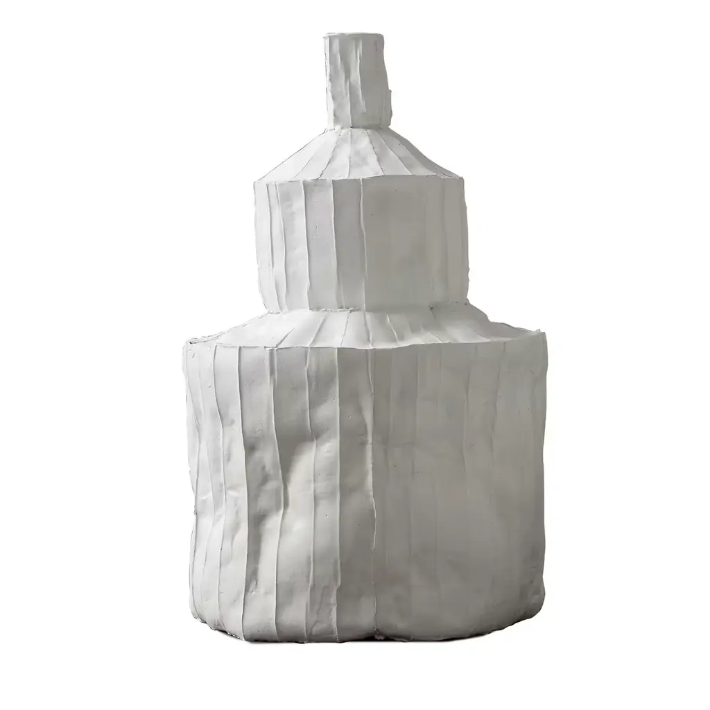 This one-of-a-kind sculpture by ceramist Paola Paronetto is part of the Fide series, inspired by the religious architecture of cathedrals. The silhouette is composed of three cylinders stacked in decreasing order with an eye-catching ridged surface resulting from the handcrafting process and kilning of paper clay, a special compound of clay-base enriched with paper pulp and natural fibers, that gives it a paper-quality appearance. The delicate rose color adds a finishing touch of glamour and versatility. Every one of Paola Paronetto’s creations is unique. Slight variations in shape, colour and size are to be considered a guarantee of authenticity and value. They are finished with non-toxic satin-finish enamels. Although very rarely, it is possible for them to leak after long periods of exposure to water. It is therefore advisable to test their water resistance before using them on delicate surfaces. They should not be used as dining utensils. The white pieces can be washed with water or sanitizing products, whereas the coloured pieces must be treated more gently and cleaned with a feather duster or a soft cloth, dry or moistened very slightly with water.