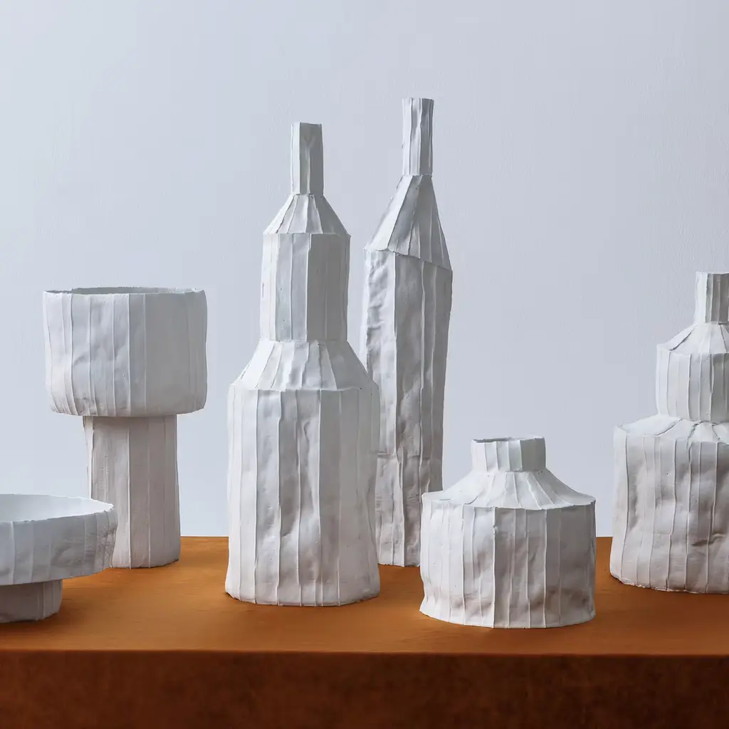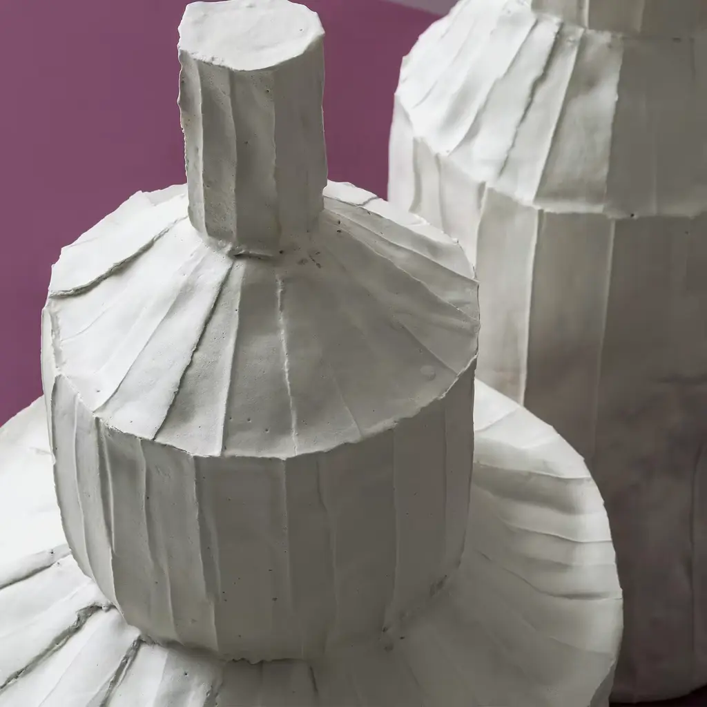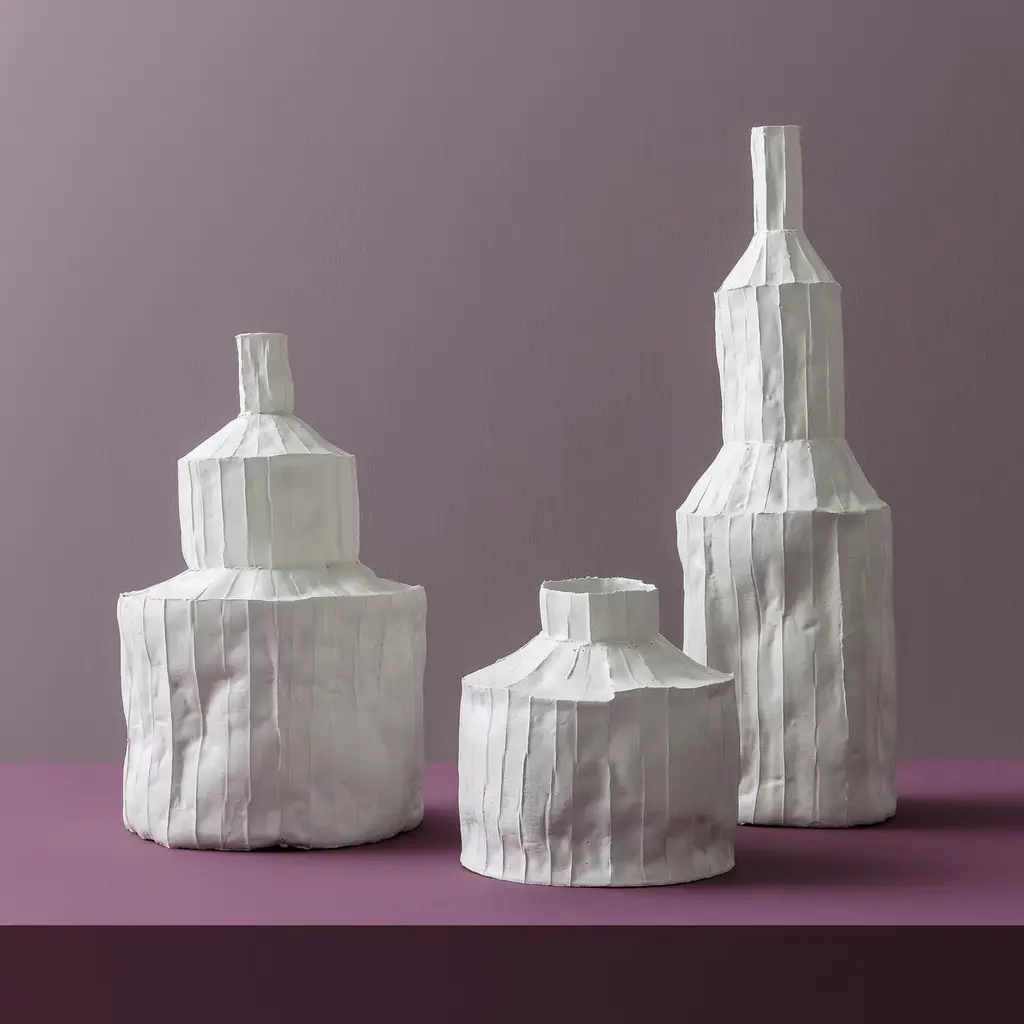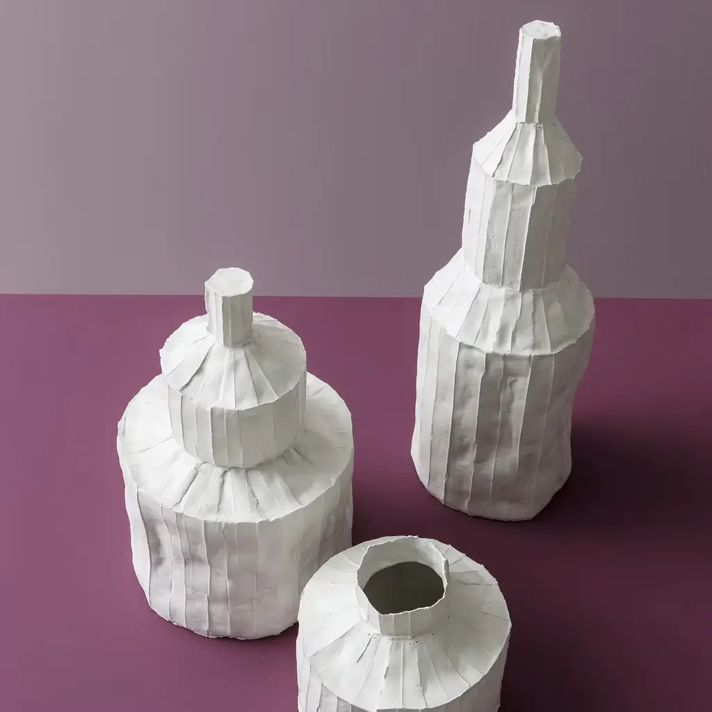 Part of the Fide series of sculptures, inspired by the majestic architecture of the cathedrals, this bottle-shaped piece is handcrafted in Paronetto’s signature paper clay, a clay base with paper pulp and natural fibers. The silhouette rises from three tiers of round shapes in decreasing size, with a textured surface of vertical segments. The bright white color adds an ethereal flair to this unique still-life object that can be displayed with other pieces from the same designer for a refined look.. Every one of Paola Paronetto’s creations is unique. Slight variations in shape, colour and size are to be considered a guarantee of authenticity and value. They are finished with non-toxic satin-finish enamels. Although very rarely, it is possible for them to leak after long periods of exposure to water. It is therefore advisable to test their water resistance before using them on delicate surfaces. They should not be used as dining utensils. The white pieces can be washed with water or sanitizing products, whereas the coloured pieces must be treated more gently and cleaned with a feather duster or a soft cloth, dry or moistened very slightly with water.
